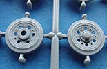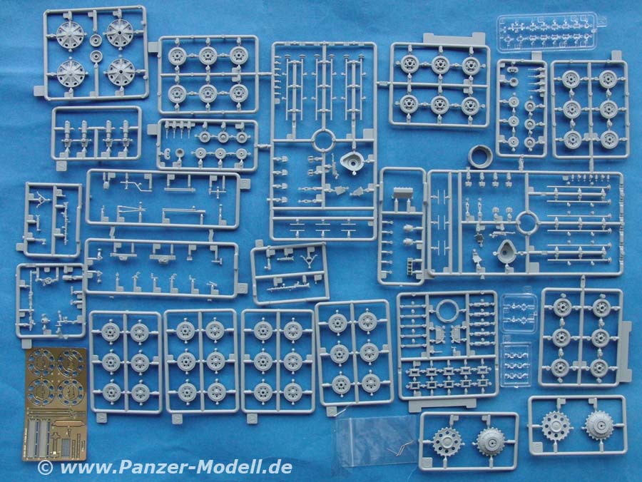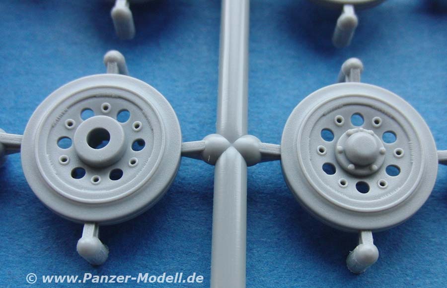 Die Laufrollen sind exzellent und realistisch dargestellt in der schmalen Ausführung und ohne Absatz zum Gummi. Die späteren Laufrollen liegen dem Bausatz übrigens auch bei, wennauch man diese für die Ausf.E nicht gebrauchen kann. Überhaupt liegen reichlich Teile bei, die nicht benötigt werden und so in die grabbelkiste wandern können.