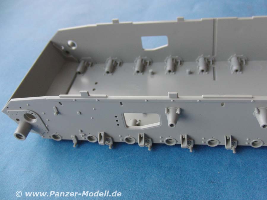 Die Unterwanne ist ebenfalls die richtige frühe Panzer III Wanne mit den seitlichen Notausstiegen. Erfreulicherweise sind die Schwingarme wieder mit Drehstäben zum Einstecken versehen, sodass man die Federung wirklich beweglich machen kann.