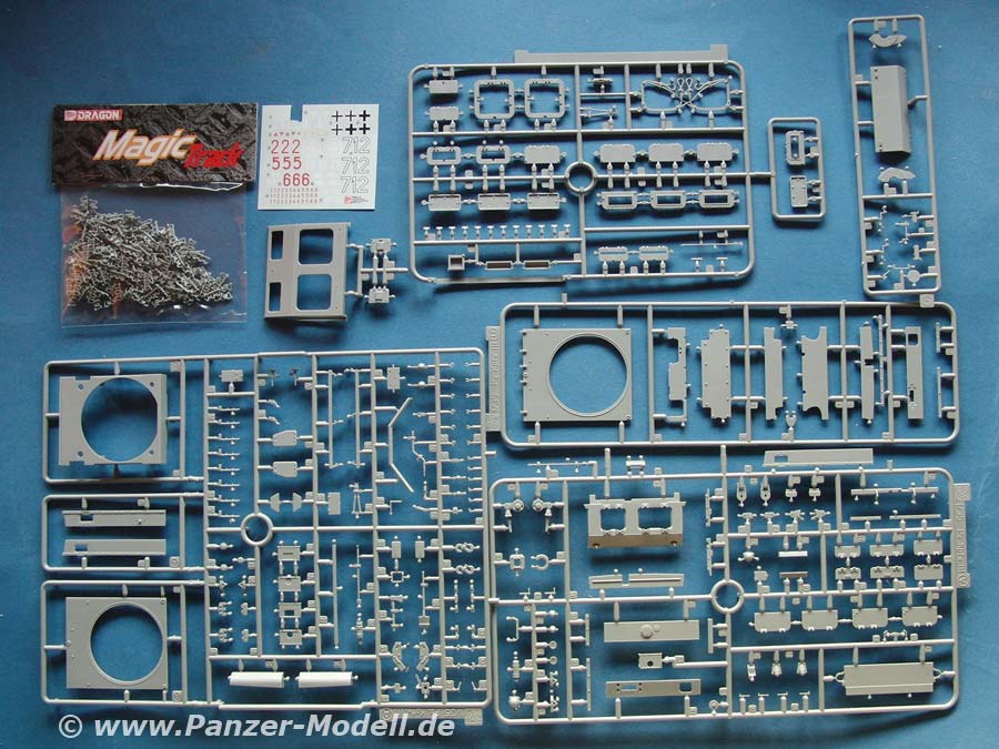 Im Bausatz enthalten sind über 700 Teile an 15 mehr oder weniger großen Spritzlingen, Magic Tracks, Fotoätzteile, durchsichtige Plastikteile, Unterwanne, vorgebogene Metallteile und ein Decalbogen.