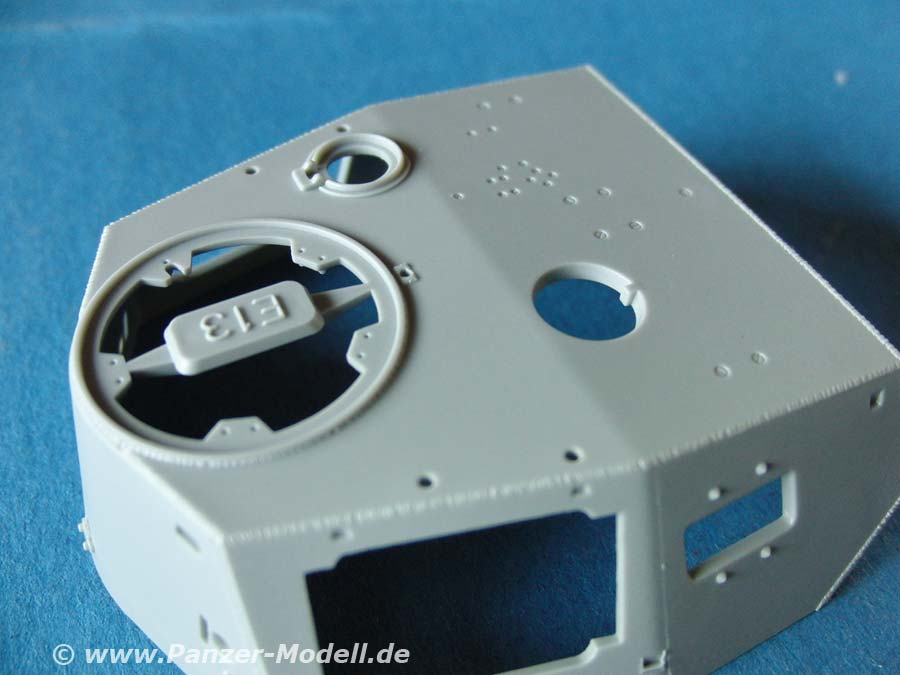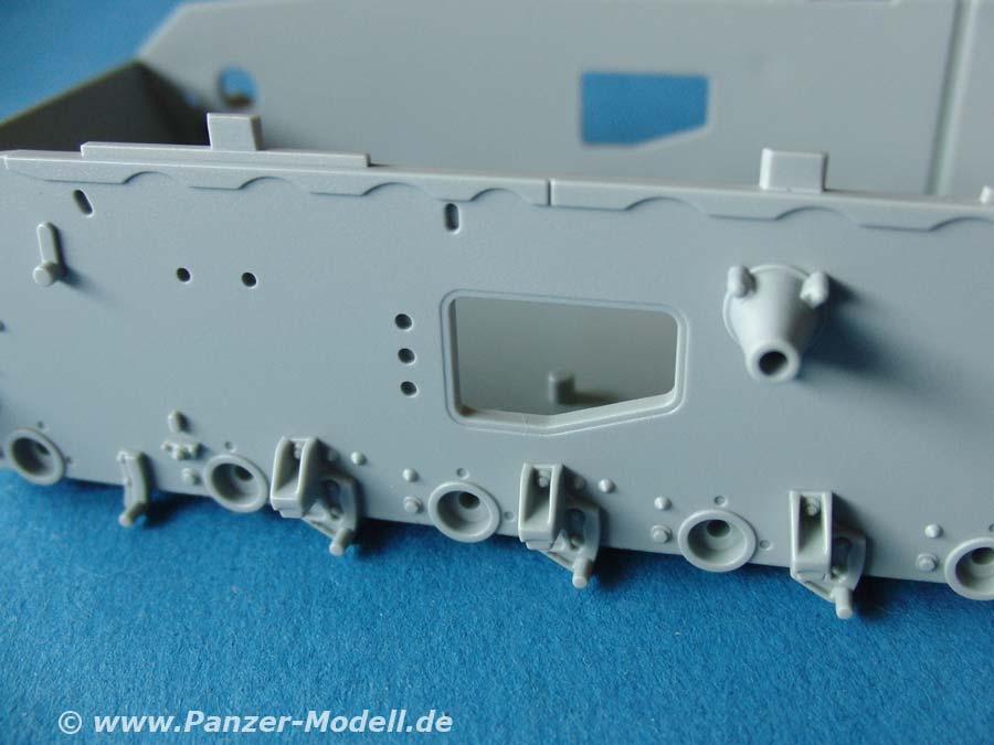 markenzeichen der ausf.H sind die zusätzlich aufgebrachten Panzerplatten an Front Seite und Heck. Diese sind mit ihren Nieten recht schön dargestellt.
