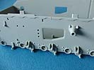Die Unterwanne macht wie immer einen guten Eindruck und ist mit den Notausstiegsluken versehen, die in dieser Ausführung noch vorhanden waren. Das Laufwerk ist wieder mit funktionierenden Drehstabfedern versehen, sodass man bei Verwendung einer beweglichen Kette auch ein einfederndes Laufwerk hat - gerade für Dioramenbauer ist dies von Vorteil. Die Laufrollen sind die für diese Version richtigen, da mit der Ausf.H auf die 40cm Kette umgestellt wurde. Demzufolge ist auch die allseits bekannte und beliebte 40cm Magic Track enthalten, die bereits versäuberte Kettenglieder in Tütchen verpackt beinhaltet.