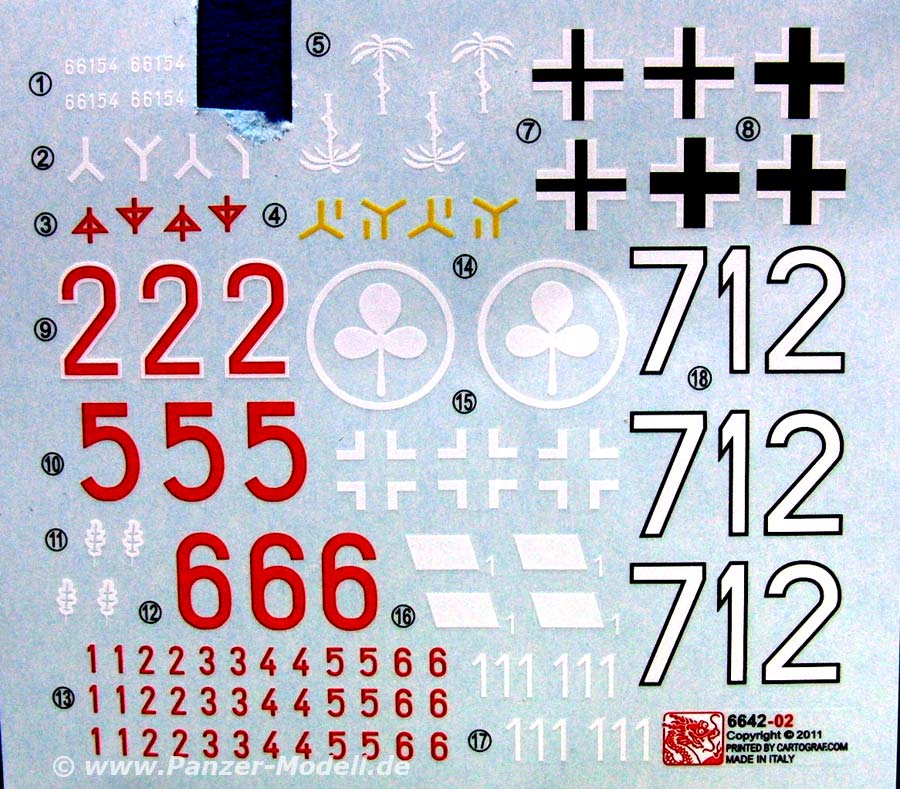 An Markierungen stehen mit dem Decalbogen und der Anleitung Möglichkeiten für 5 verschiedene Versionen zur Verfügung. Für den deutschen Markt musste am Decalbogen wieder etwas zensiert werden - dies betrifft erschreckenderweise auf diesem Decalbogen offenbar die kleinen weißen Balken, die Dragon separat gedruckt hat, damit der Modellbauer damit die DAK Palme wieder ordnungsgemäß zusammensetzen kann - Schade dass nun auch diese Möglichkeit der historisch korrekten Darstellung hierzulande verwehrt bleibt.