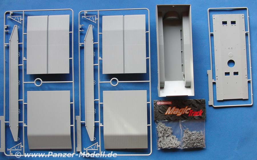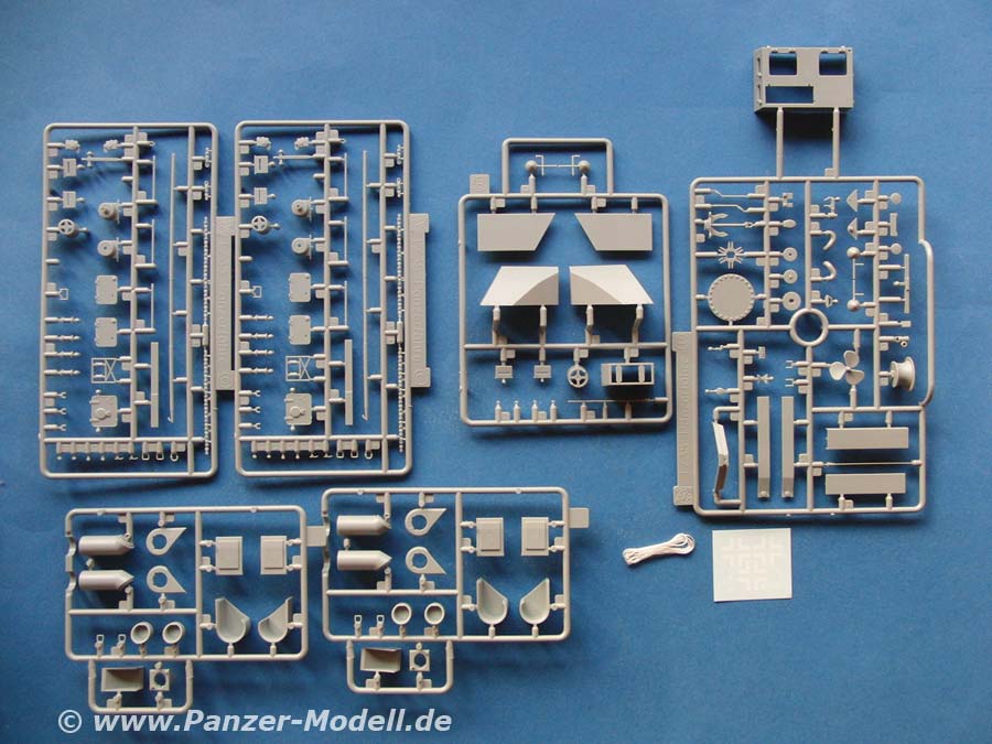 Im Bausatz enthalten sind über 510 Teile an 14 mehr oder weniger großen Spritzlingen, Magic Tracks, Fotoätzteile, durchsichtige Plastikteile, Unterwanne, Seilmaterial und ein kleiner Decalbogen.