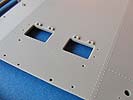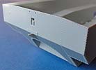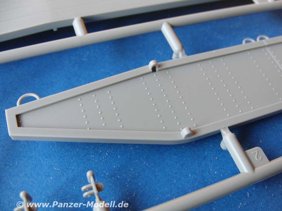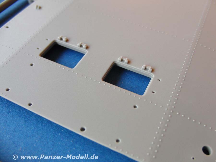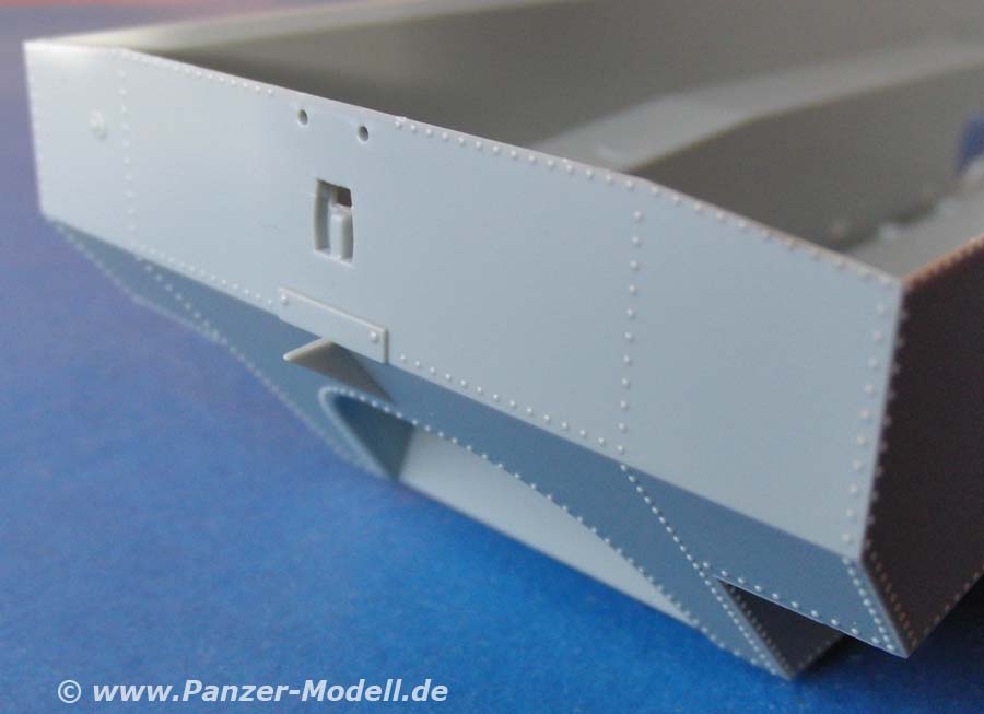 Auch das Wannenoberdeck ist sehr schön mit feinen Nietenreihen versehen und verschiedenen Anbauteilen, wie Pollern, Anker, Zugangsluken und dem Fahrer/Funkeraufbau - dieser ist wesentlich verlängert und im hinteren Bereich mit einem hohen und oben offenen Kommandantenzugang versehen. Der Kran am Wannenheck ist leider nur im zusammengeklappten Zustand dargestellt.
