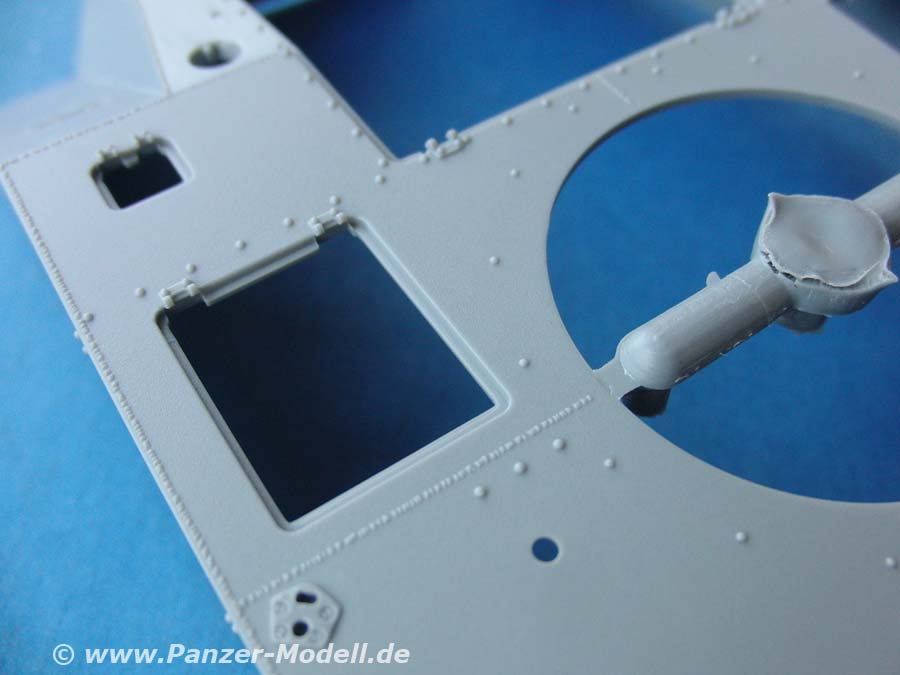 Der Turm ist hervorragend in seiner Form und so feinen Details wie den Nieten wiedergegeben. Die Kanone ist zwar nur aus Plastik, aber dafür in einem Stück und recht gelungen. Gerade am Turm gibt es recht viele Optionsteile der Klappen und Anbauteile.