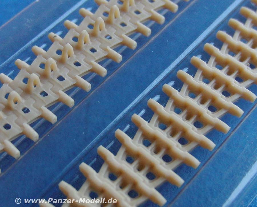 Das Laufwerk ist sehr schön dargestellt - die Laufrollen weisen sehr feine Rippen und Löcher auf - eine Augenweide. Die Kette ist zwar "nur" eine DS Kette, diese ist aber so fein und detailliert, dass es fast unglaublich ist, dass dies eine einteilige Vinylkette ist, die sich normal verkleben und bemalen lässt. und vor allem ist diese schnell und einfach aufziehen. Einziger Nachteil, den ich hier sehe - Kettendurchhang ist schwer darstellbar.