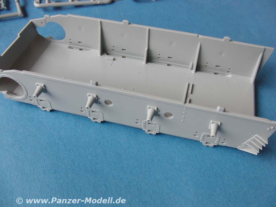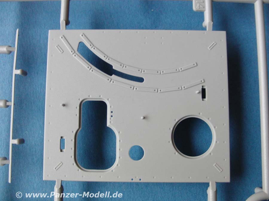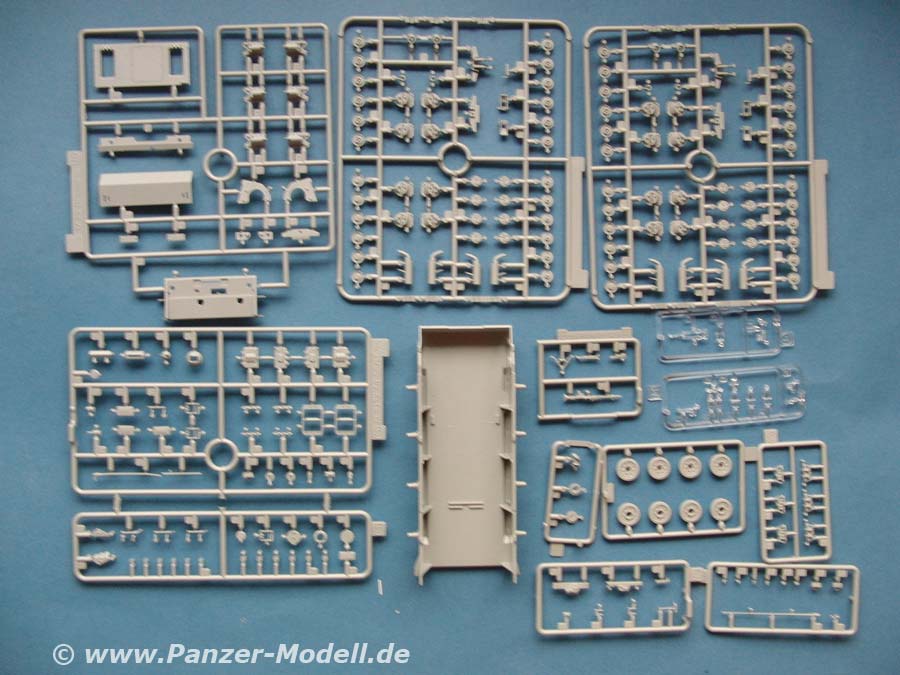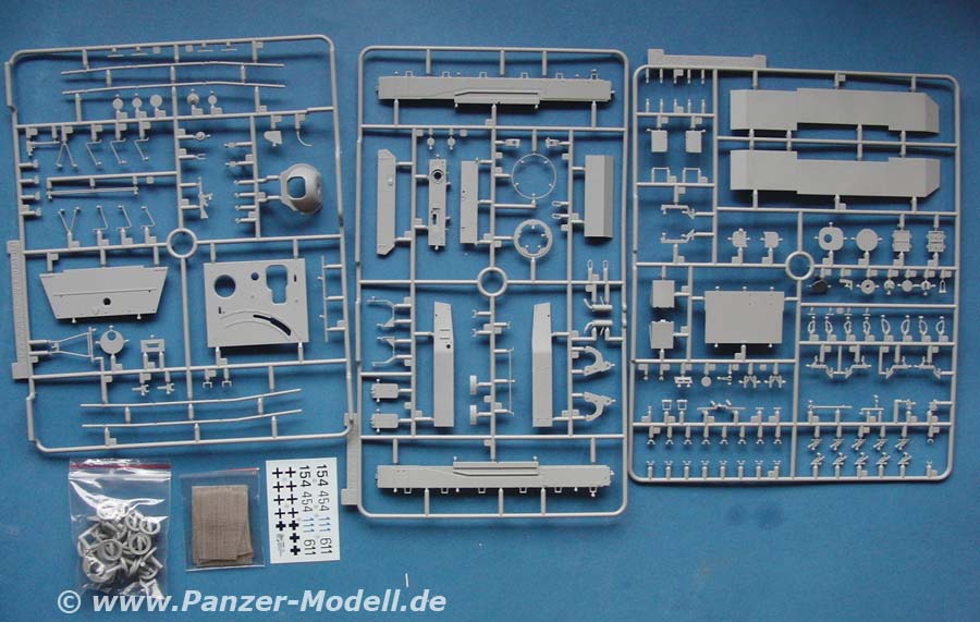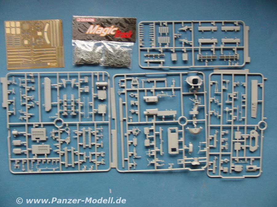 Im Bausatz enthalten sind über 680 Teile an 24 mehr oder weniger großen Spritzlingen, dazu 2 Spritzlinge mit Klarsichtteilen, Magic Tracks, die Unterwanne, Schürzenelemente aus Drahtgeflecht, Laufrollenringe, Fotoätzteile und ein Decalbogen.