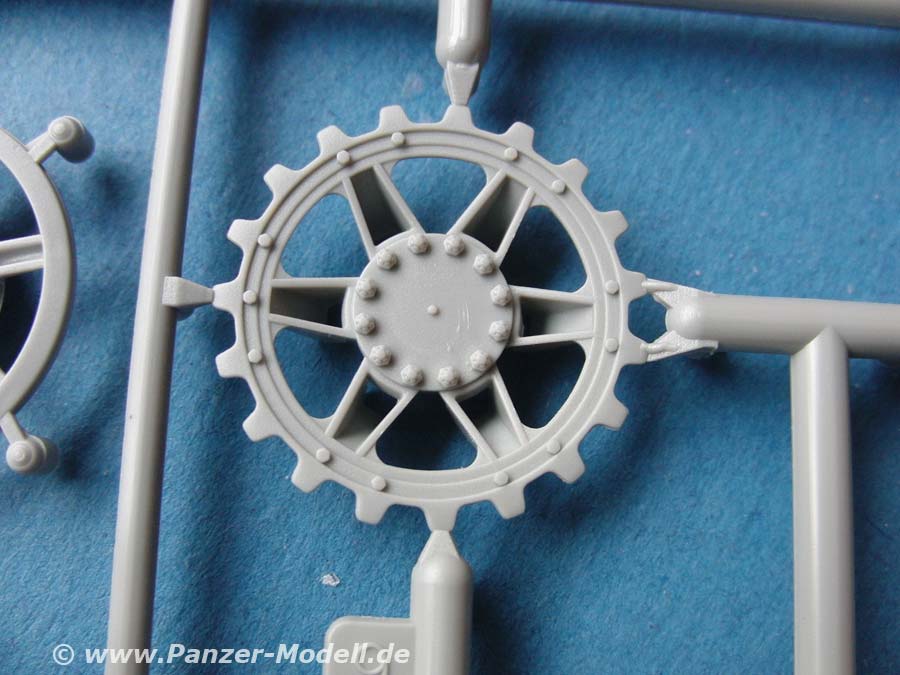Die Laufrollen umfassen natürlich die gummierten als auch die Stahllaufrollen. Letztere werden aus jeweil 7 einzelnen Teilen zusammengesetzt. Für die Stützrollen liegen dem Bausatz 3 verschiedene Versionen bei - Dragon verschweigt zwar was es mit den unterschiedlichen Versionen auf sich hat, aber der Modellbauer hat zumindest die Auswahl.