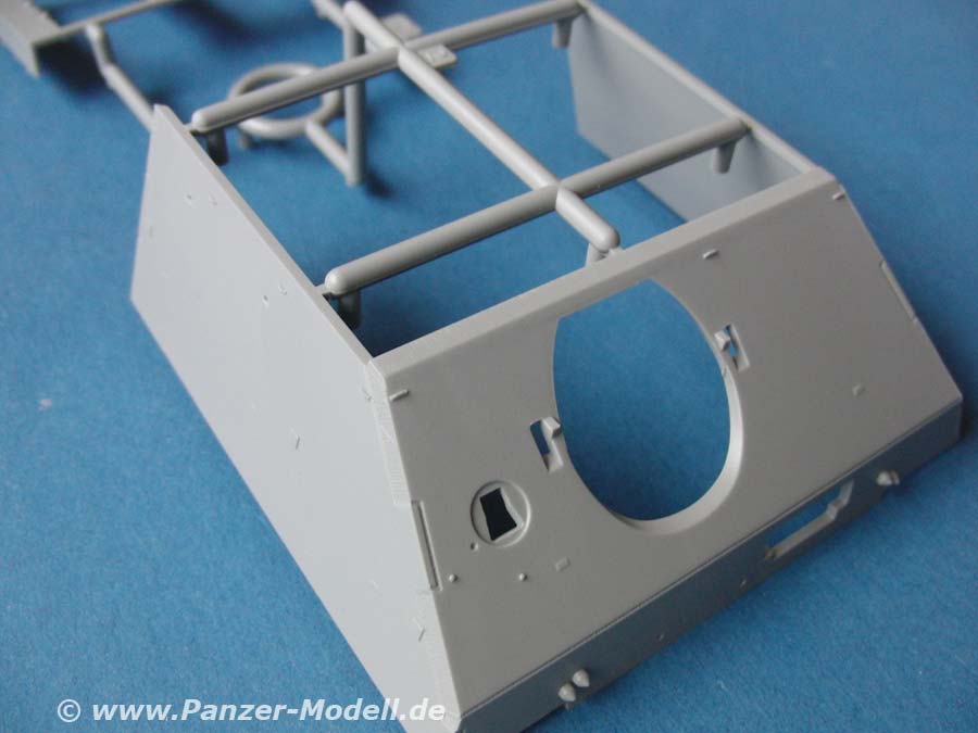 Was an der Heckplatte in der ersten Auslieferung offenbar in Baustufe 5 fehlt, ist der obere Aufsatzteil am Heck (Teil C8, wie im Ostwind oder späten Panzer IV J). Dragon ist offenbar dabei dies nachzuarbeiten. Man kann notfalls auch Teil N18 aus diesem Bausatz nehmen und die seitlichen Verstärkungen aufbauen.