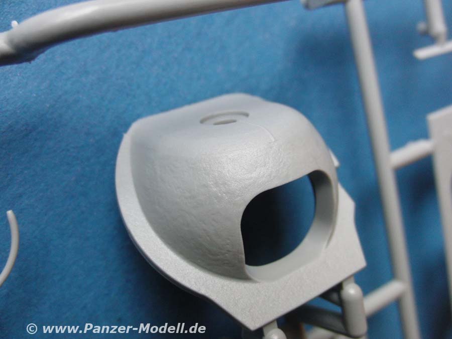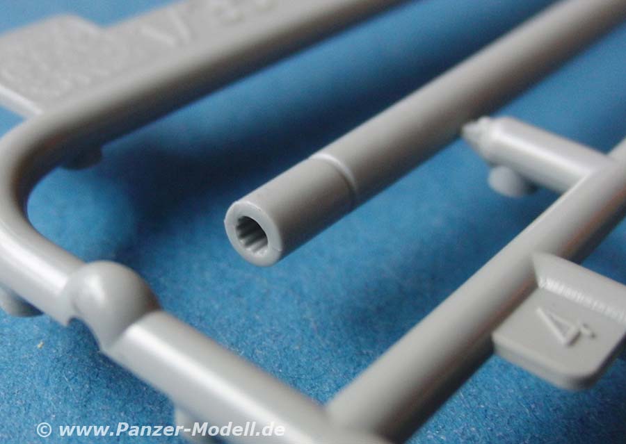 Für die Kanone liegt ein einteiliges Kanonenrohr aus Plastik bei. Dies macht einen recht passablen Eindruck und weist an der Münsung Felder und Züge auf. Auch das Innenleben mit Veschluss und Zubehör sind dargestellt. Was in der Bauanleitung unterschlagen wird, ist die genau Befestigung der Kanone im Inneren.