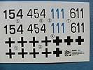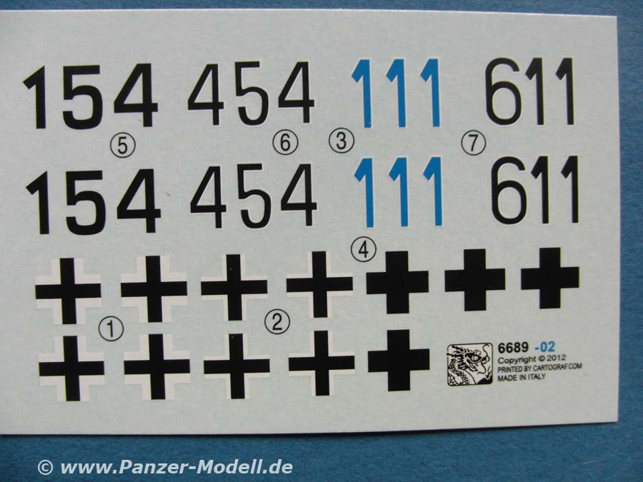An Markierungen steht mit dem kleinen Decalbogen und der Anleitung Möglichkeiten für sieben Versionen zur Verfügung. Der Decalbogen umfasst dabei verschiedene Balkenkreuze und drei "Turm"nummern. Die Bemalungsanleitung zeigt folgende mögliche Tarnschemen: