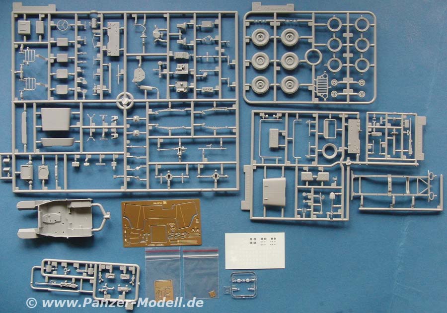 Im Bausatz enthalten sind über 120 Teile an 5 mehr oder weniger großen Spritzlingen, das Chassis, Fotoätzteile und ein Decalbogen.