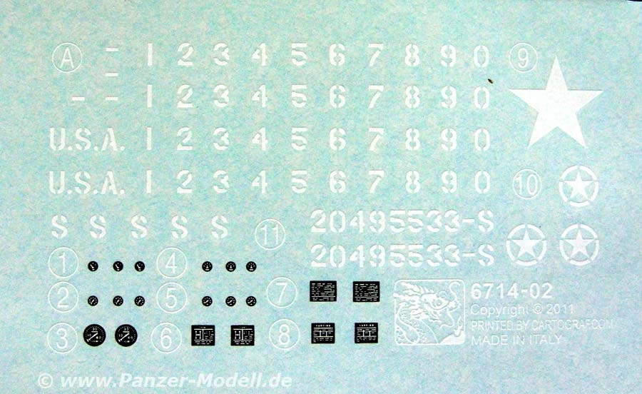 An Markierungen steht mit dem kleinen Decalbogen und der Anleitung Möglichkeiten für eine Version zur Verfügung, nämlich einer in Olive Drab 1945 an der Westfront. Aber der Decalbogen bietet auch vier komplette Sets an zahlen, die man nach Gusto selber zusammenstellen kann.