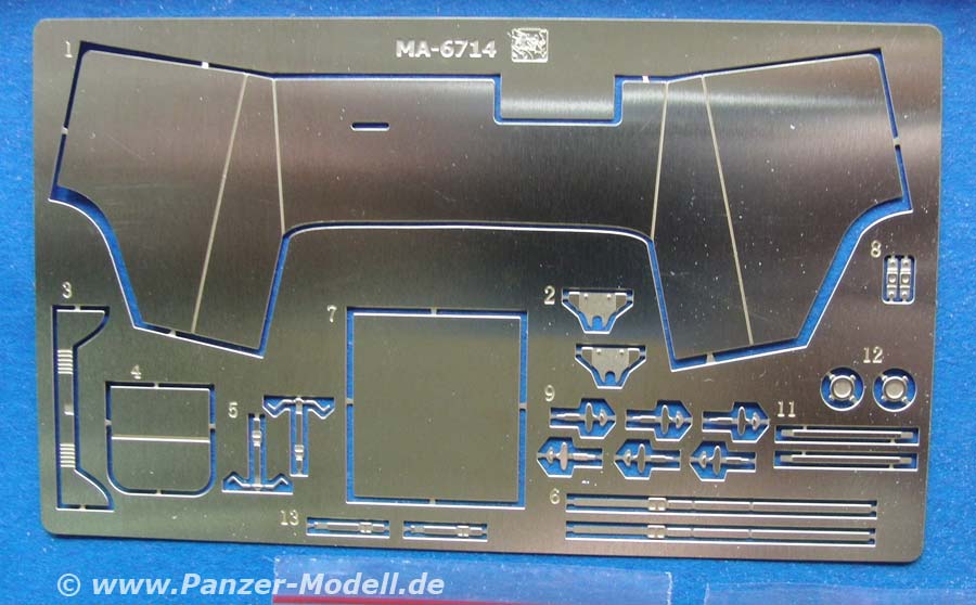 Feine Details wie Ösen udn Halterungen sind aus PE Teilen und natürlich das Panzerblech vor dem Kühler. Die Aufbaupanzerung ist aus einem großen und maßstäblich korrekt dicken PE Blech gemacht - hier braucht man wahrscheinlich eine Biegehilfe oder zumindest eine Zange.