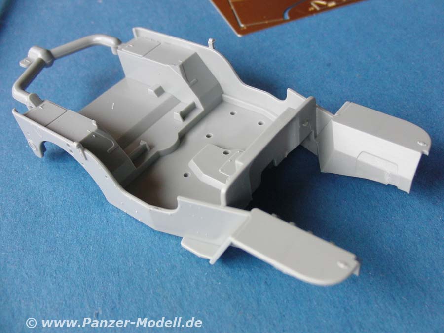 Die Karosserie ist in einem großen Teil gespritzt mit guten Details. Hier werden die Sitze und Sitzbank (mit Struktur), sowie die Armaturen und natürlich das schwere Browning MG auf Standfuß eingebaut. Das Browning macht einen sehr guten Eindruck, dafür dass es ganz aus Plastik ist.