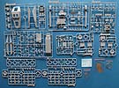 Hier finden wir 16 mehr oder weniger große graue Spritzlinge, einen transparenten Spritzling, die Unterwanne, die Kette als Magic Tracks, zwei PE Platinen, Metalldraht und ein Decalbogen.
