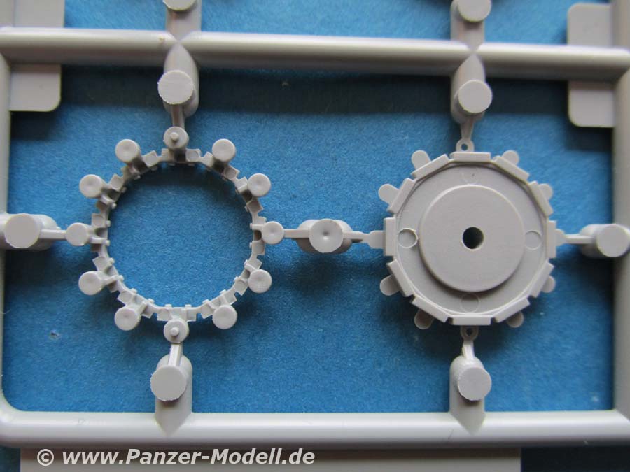 Die Kette ist erstaunlicherweise mal wieder von der Magic Tracks Sorte, d.h. mit bereits versäuberten einzelnen Kettengliedern und Kettenpolstern zum beweglichen Zusammenbau. Diese sehen recht gut und detailliert aus - leider zeigen die Innenlaufflächen der Glieder zwei Auswerferstellen auf, die man erst noch verschleifen müsste.