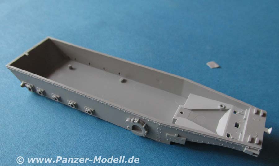 Die Oberwanne ist komplett neu und setzt sich aus mehreren Teilen zusammen für den speziellen Aufbau des Munitionsträgers Sd.Kfz.252. Die Luken zu Motorraum, sowie zum Crewraum und hinterer Laderaum sind offen und können mit den Luken offen oder geschlossen gebaut werden. Für den Motorraum liegt eine Motordarstellung bei - nicht superdetailliert, aber für die beschränkte Einsicht durch die Motorklappen soweit ausreichend.