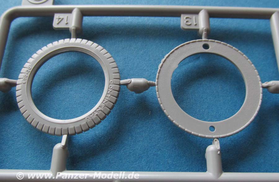 Die Vorderräder setzen sich aus zwei Halbteilen zusammen mit schöner Darstellung des Profils und Herstelleraufdrucken auf den Reifenflanken.
