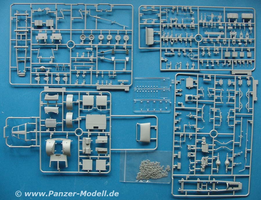Das Halbkettenlaufwerk setzt sich ebenfalls aus ausgezeichnet dargestellten Laufrollen zusammen - diese sind vom Typ mit den vier Löchern. Die Kette ist eine Magic Track, d.h. die Kettenglieder sind bereits einzeln in einem Beutel und komplett versäubert, sodass man ohne Umschweife zum Zusammenbau schreiten kann.