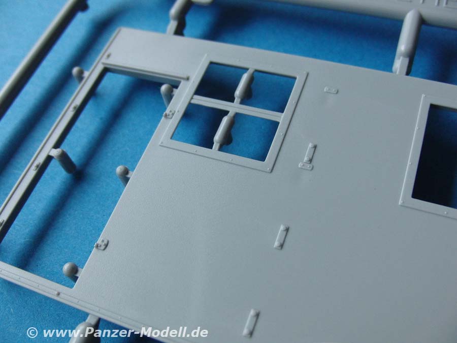 Die Seitenwände und natürlich die heckwand erfreuen zudem mit Türen, die man offen darstelllen kann. Durch diese und die mit Klarsichtteilen zu versehenden Fenster kann man ganz gut in den Innenraum blicken. Die Heckwand besteht eigentlich nur aus zwei großen Türen und einer schön gestalteten Treppe mit einzelnen Stufen. Diese lässt sich entweder hoch oder abgeklappt darstellen.