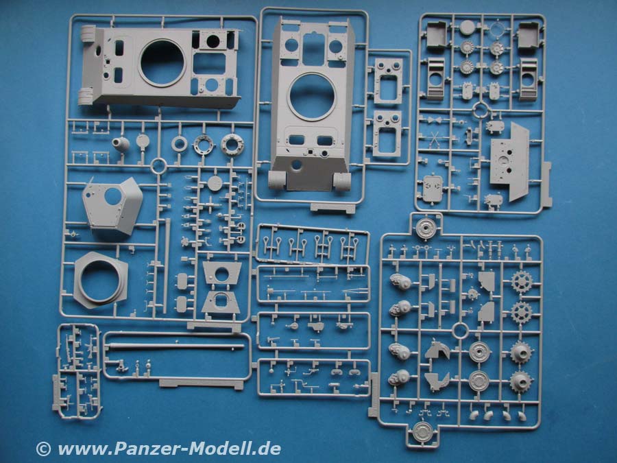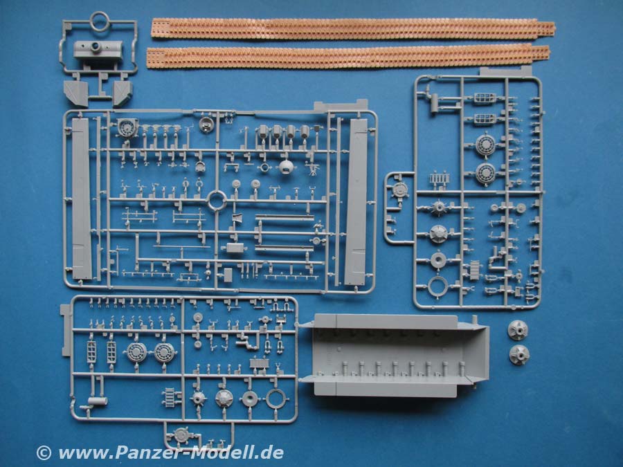 Schauen wir also mal in den Karton. Dieser ist wieder einmal randvoll mit 16 Spritzlingen, einem Spritzling mit Klarsichtteilen, Unterwanne, 2 einzelnen Leitradteilen, 2 DS Ketten, 3 PE Platinen, Metallteile und ein kleiner Decalbogen.