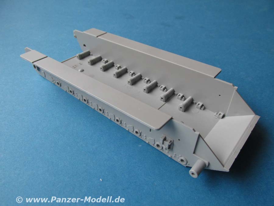 Die Wanne wird weiter mit Seitenteilen, Bug- und Heckwand vervollständigt und auch hier zeigen sich schöne Details und Optionsteile wie der Ausführung der Auspuffrohre, entweder als normale oder Flammvernichterrohre.