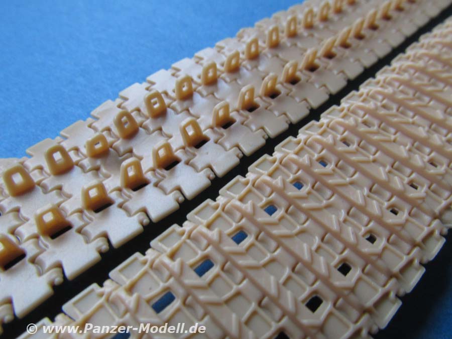 Die Ketten sind "leider" die DS Ketten, die bei Dragon immer mehr in Mode kommen. Wobei ich ja sagen muss, dass ich diese bei Panther und Tiger Laufwerken (und den modernen Panzern sowieso) gerade noch akzeptieren kann, da ein einfacher Kettendurchhang durchaus realisierbar ist, während das bei Laufwerken mit Stützrollen einfach schwer realisierbar ist. Dennoch muss man Dragon zugute halten, dass die Qualität und Details dieser DS Ketten wirklich sehr sehenswert ist! Leider ist es aber auch so, dass gerade die Führunsgzähne durch die Lagerung im Karton schnell in Mitleidenschaft gezogen werden und in der abgeknickten Position verbleiben. Keine Ahnung ob und wie man das wieder hinbiegen kann!?