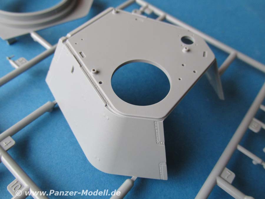 Der Schmalturm sieht sehr schön aus und setzt sich grundsätzlich aus Unterteil, Heckplatte und Blende zusammen. Das Rohr ist in einem Stück und schön sauber und gerade gespritzt. Vorn wird noch eine Mündungsbremse aufgesetzt.