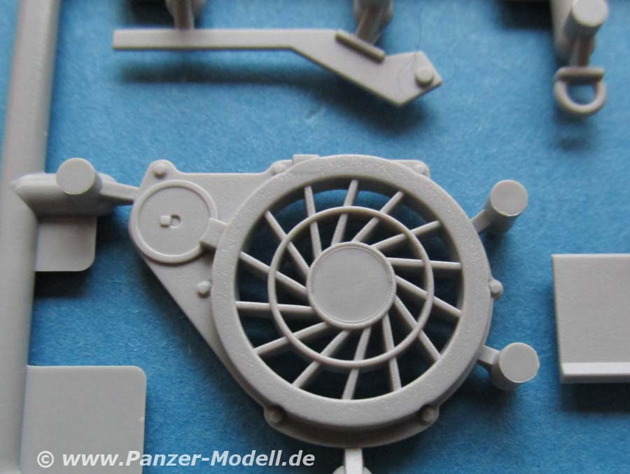 Auf dem Motordeck sind alle korrekten Details dieser frühen Version mit den Lüftergittern. Zusätzlich liegen ein paar PE Gitter bei, die sauber und fein geätzt sind.