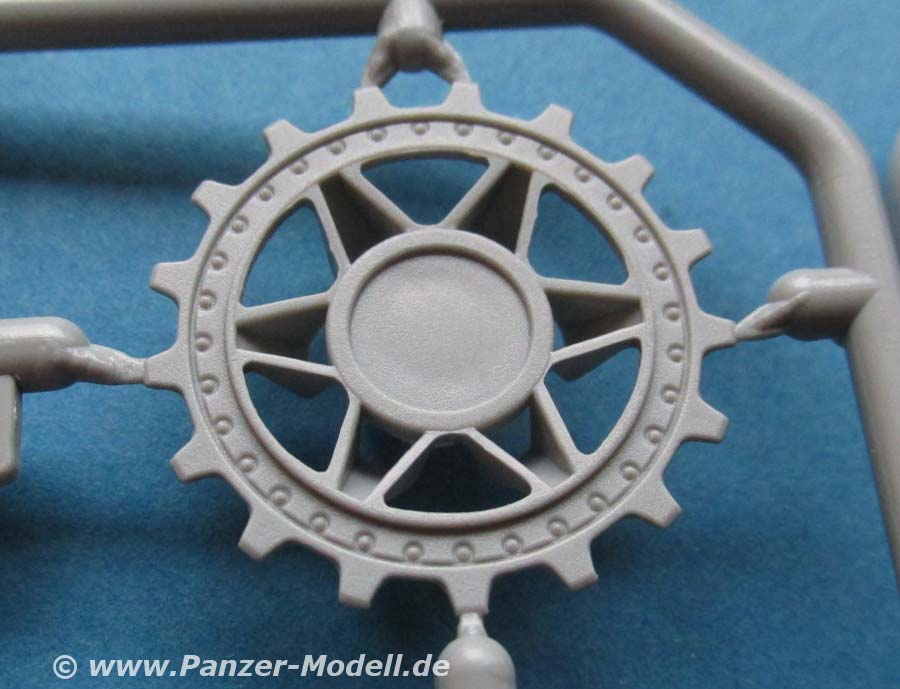 Die Unterwanne ist wie gewohnt einteilig und wird mit den entsprechenden Anbauteilen des Laufwerks versehen. Die Schwingarme werden einzeln eingesteckt und müssen geklebt werden - mit ein wenig Eigenarbeit kann man diese aber in beliebigen Positionen einbringen um das Fahrzeug im unebenen Gelände darzustellen. Die Laufrollen sind vom frühen und korrekten Typ mit 18 Bolzen. Ganz neu und einzigartig ist das Aussehen des Treibrads, das von Dragon hier korrekt wiedergegeben wird.