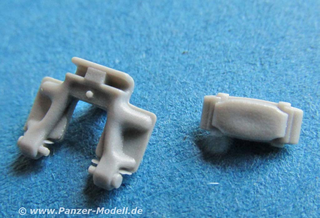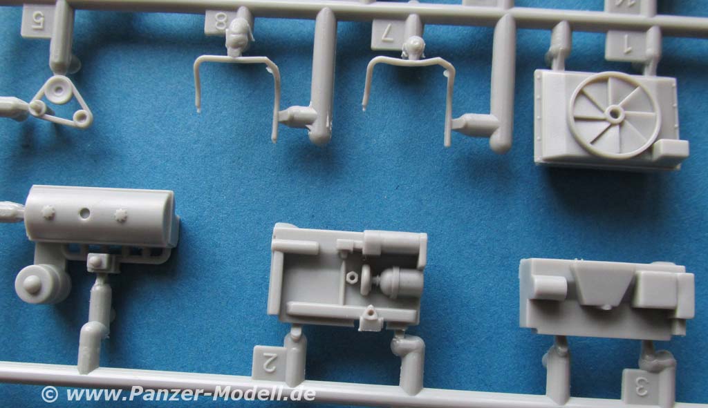 Das wäre in diesem Fall der schwere Granatwerfer, der aus wenigen Teilen und auch schon aus einem früheren Bausatz bekannt, beiliegt. Natrülich ist auch die entsprechende Basis und die Sitze der Mannschaft enthalten. Zusätzlich gibt es entsprechende Boxen und einzelne Mörsergranaten in guter Detaillierung.