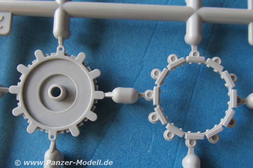 Die Laufrollen sehen exzellent aus mit sehr guten und feinen Details. Dafür weist das Treibrad, obwohl es ebenfalls neu ist, immer noch den Fehler auf, dass die Treibradzähne mittig auf den Blöcken sitzen und nicht versetzt wie beim Original.