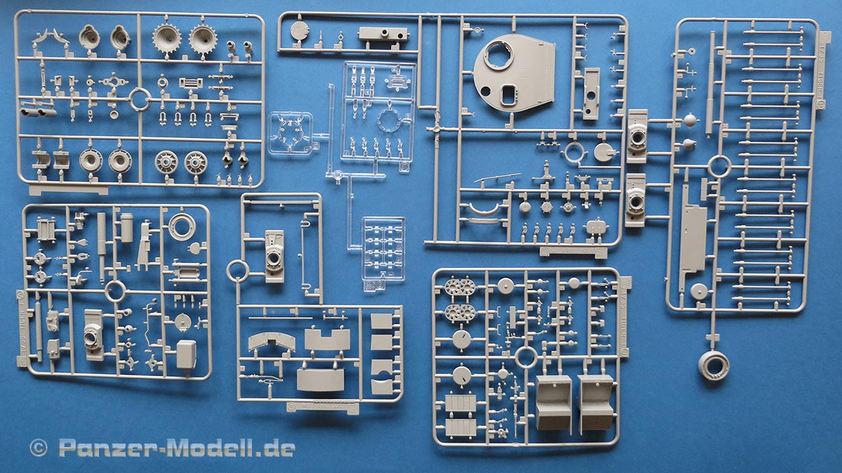 Der Karton beherbergt 21 graue und einen transparenten Spritzling, sowie die Unterwanne, den Turm, zwei DS Ketten, eine PE Platine, 4 PE Gitter und ein Decalbogen. Die Teileübersicht in der Anelitung offenbart es bereits - hier gibt es wieder mächtig Futter für die Ersatzteilkiste.