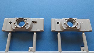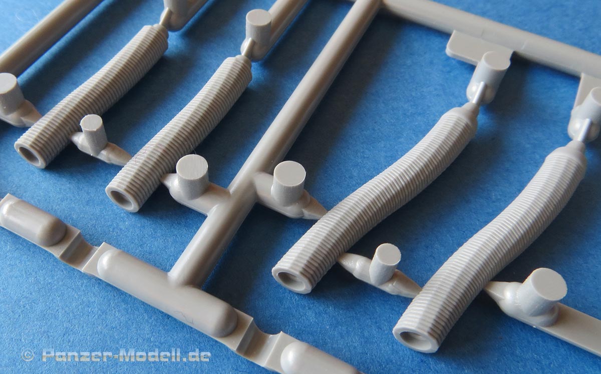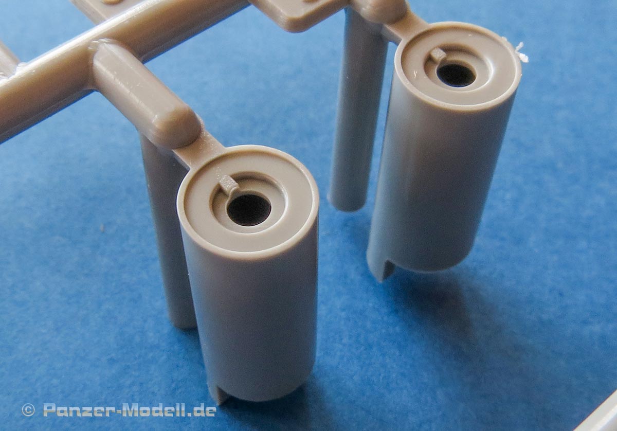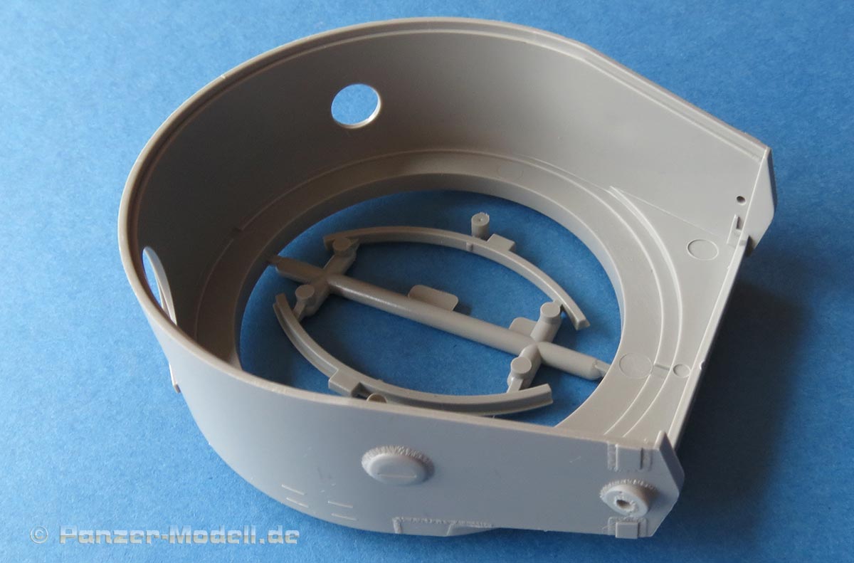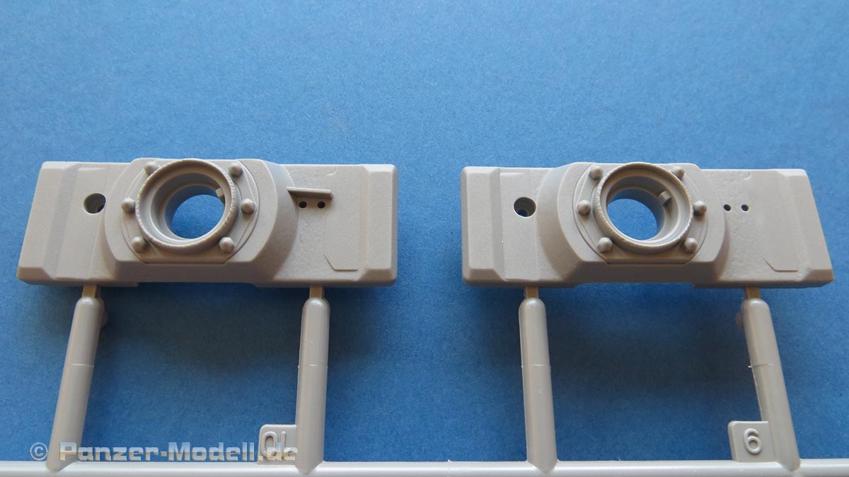 Das Turmgehäuse ist im Prinzip einteilig und wird mit der Deckplatte und der Kanonenblende vervollständigt. Die Schweißnähte am Turm sind wirklich ühänomenal - fein, unregelmäßig, einfach realistisch! Für die Kanonenblende liegen dem Bausatz ein Haufen verschiedener Versionen bei. Das Kanonenrohr selber ist zwar mehrteilig, aber eben nicht aus Halbteilen, die eine unschöne Naht nach sich ziehen würden. Auch die Mpndungsbremse ist wirklich exzellent in einem Stück gespritzt, das nur durch einen Innenring und die vordere Abschlussfläche vervollständigt wird. Sehr sehr schön.