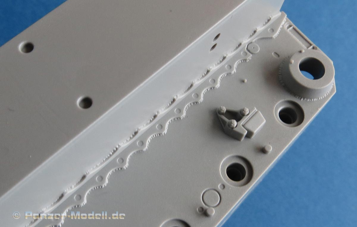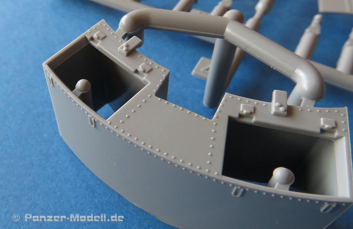 Die Heckplatte ist recht detailliert und mit recht vielen Anbauteilen unter anderem den frühen Auspuffrohren und den Abdeckblechen, die als Plastikteile beiliegen. Die Seitenteile der Oberwanne liegen einzeln bei zum Aufkleben auf die Basis - die Aussenseite muss dann je nach Ausführung ein bisschen in Details verändert werden.