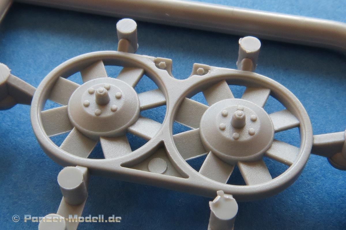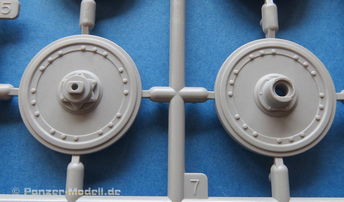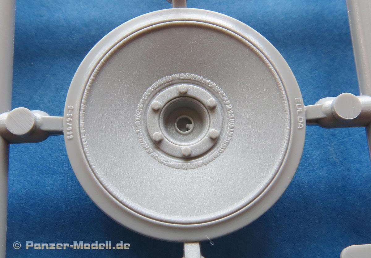Die Laufrollen sind die typischen frühen Laufrollen des Tigers mit Gummibandagen. Diese sind wunderbar fein und sauber gespritzt mit den verschiedenen Innen- und Aussentypen der Räder. Die Darstellung mit den Radmutternbolzen und Schweißnähten ist wirklich ausgezeichnet und sehr fein. Auch die Herstelleraufdrucke auf den Gummibandagen sin wirklich ultrafein und gelungen - und erstaunlicherweise hat man hier mal einen anderen Hersteller als immer nur Continental - hier hat Dragon nun Bandagen von Fulda - bzw. geht Dragon hier auf Nummer sicher und hat "EULDA" aufgedruckt - mit einem kleinen Schnitt mit dem Skalpell hat man dann aber den richtigen Hersteller drauf.