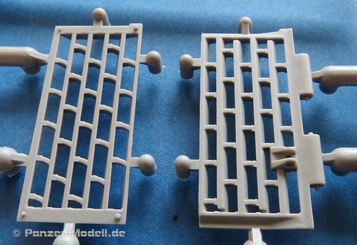 Die Oberwanne wird mit einer einteiligen Deckplatte abgeschlossen. Die Motorraumplatte und hinteren Grätings werden noch einzeln eingesetzt. Für die Lüftergrätings hat Dragon fein geätzte und optisch sehr ansprechende PE Gitter geigelegt, die zudem einzeln beiliegen - also kein Heraustrennen aus der Platine und versäubern.