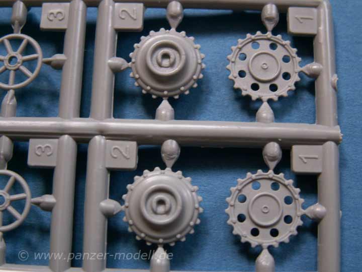 Die Wanne weist beeindruckende Details sogar an der Unterseite auf und das Laufwerk kann aus mehreren Einzelteilen montiert werden. Es liegen 2 verschiedene Treibräder bei, die Kanone aus mehr als 10 Teilen insgesamt und die Mündungsbremse liegt separat bei. Dazu kommen fast 20 Teile für die Kanonenlafette - insgesamt sehr gut detailiert!