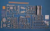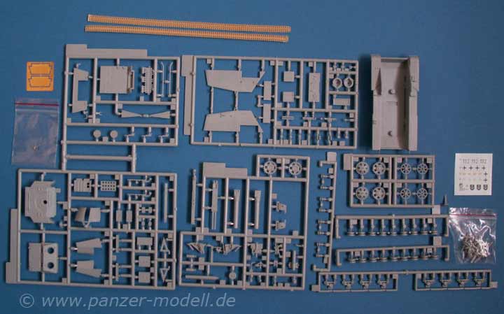 Der Bausatz enthält 140 Bauteile die unter anderem neue Treibräder für die späte Hummel enthalten, wie auch Stahlstützrollen, PE Teile für Abdeckungen der seitlichen Lufteinlässe und ganz besonders toll finde ich die komplett fertig vorgebogenen Halterungen für die Ersatzlaufrollen aus Draht. Die Laufrollen sind angenehmeweise bereits als Doppelrollen ausgelegt, die nur noch mit der Aussenscheibe detailiert werden. Die Kanone ist gut detailiert und frei beweglich.