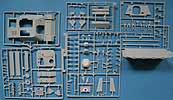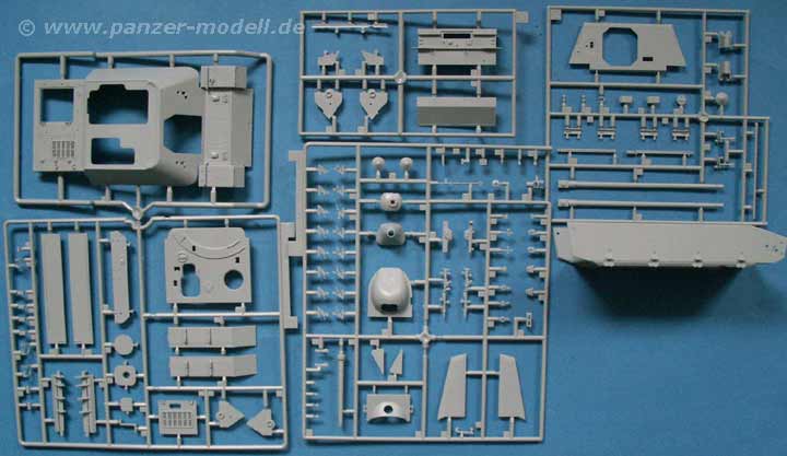 Ansonsten bietet der Bausatz eine Fülle an sehr feinen Teilen mit guten Details. Die Oberwanne und Anbauteile sind komplett neu und exzellent dargestellt, unter anderem feine Gussstruktur der Kanonenaufnahme in der Frontplatte. Das Rohr ist wahlweise als Metall oder Plastikrohr verbaubar. Am Heck gibt es diverse Wahlmöglichkeiten der Werkzeug und Zubehöranbringung.