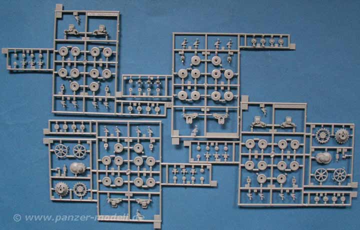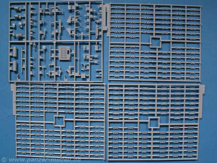 Der Karton beinhaltet 12 Spritzlinge plus Unterwanne, sowie ein gedrehtes Metallrohr, Klarsichtplastik für Winkelspiegel und ein Satz PE Teile für Schürzenteile und Befestigung. Die Kette liegt erfreulicherweise als Einzelgliedkette bei - leider hat diese wieder das Dragon-Manko, die Auswerferstellen auf der Innenseite.
