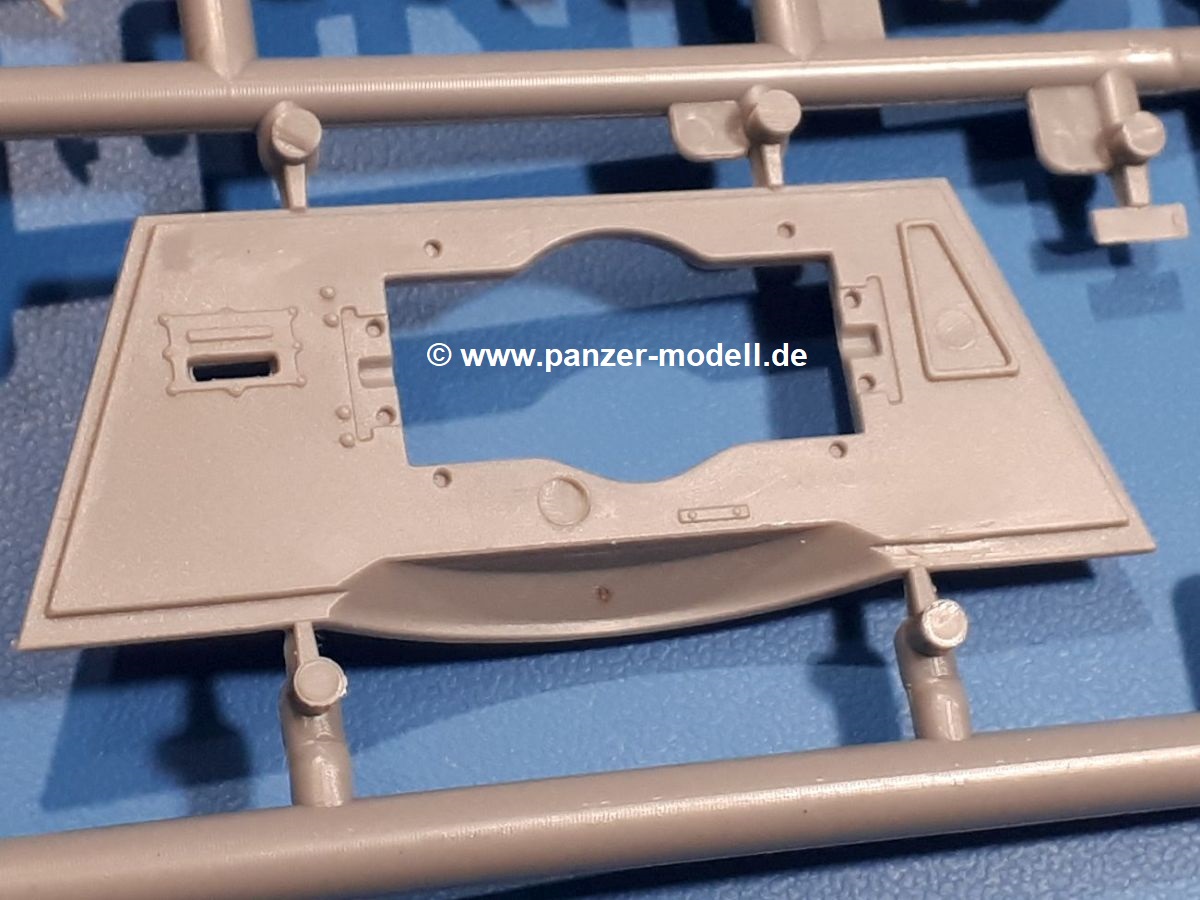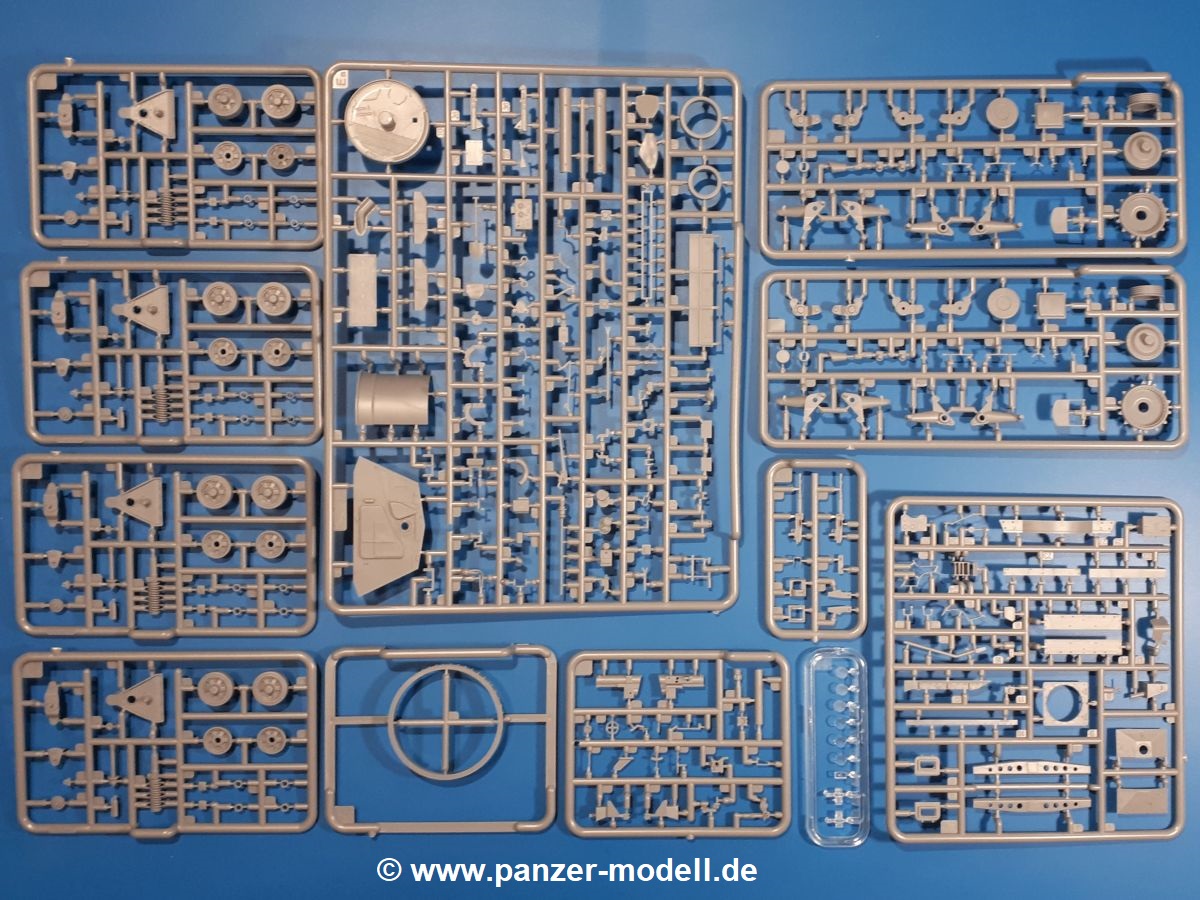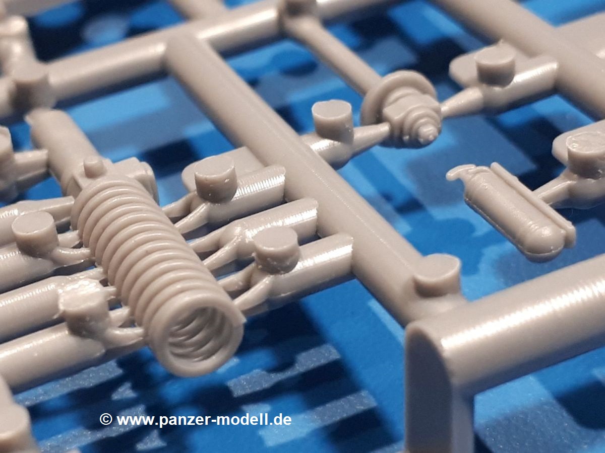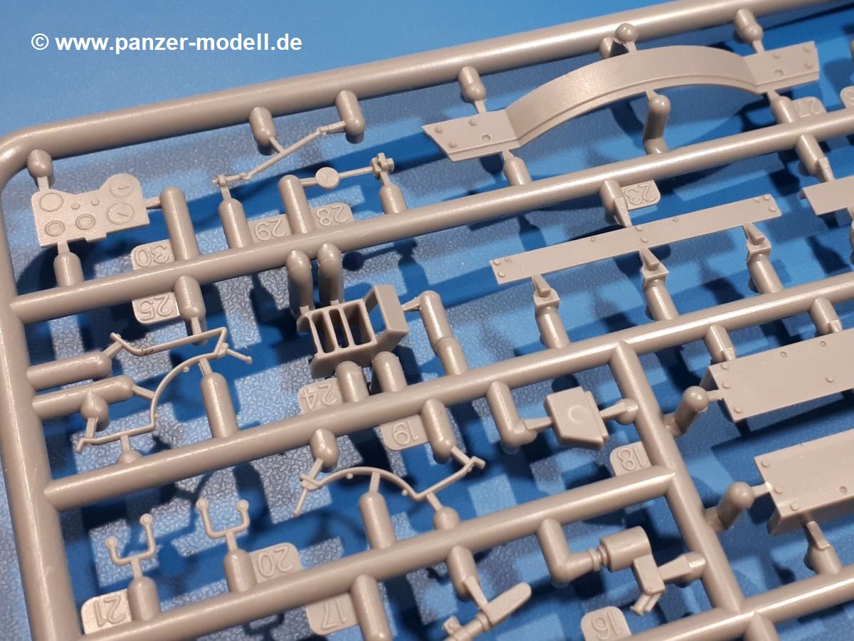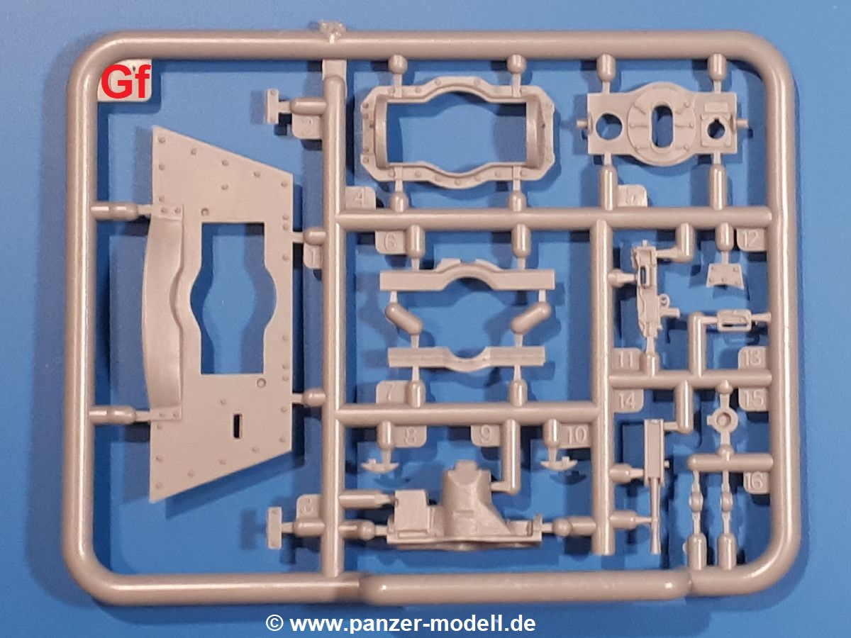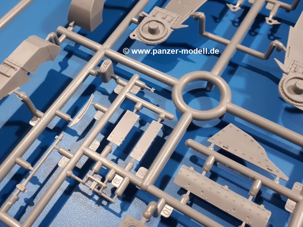 Das Original: In den 1930-er Jahren parallel zum Cruiser Mk. I (A9) entwickelt, war der A10 in der Rolle eines schweren Infanteriepanzers vorgesehen, die er aber nicht erfüllen konnte und deswegen als schwerer Kreuzerpanzer eingesetzt wurde. Es gab ihn in 3 Versionen - Mk. II (40mm 2-Pfünder Kanone, 1 koaxiales Vickers-MG), Mk. IIA (40mm 2-Pfünder Kanone, 1 koaxiales Besa-MG, 1 Besa Bug-MG) und Mk.IIA CS (94mm Howitzer, 1 koaxiales Besa-MG, 1 Besa Bug-MG). Mit seinem 150 PS Motor erreichte er grad mal 26 km/h auf der Strasse, 13 km/h im Gelände. Insgesamt wurden 175 Mk. II produziert. Er wurde Anfang des 2. Weltkrieges in Frankreich, später auch in Nordafrika und Griechenland eingesetzt. Er lieferte aber keine zufriedenstellenden Ergebnisse und wurde später durch den Cruiser Tank Mk. III (A13) ersetzt. Der Bausatz: Schon länger in der Vorankündigung kommen nun endlich die ersten Gecko Model Bausätze auch auf dem deutschen Markt an.Im Karton finden wir einen Klarsicht- und 35 hellgraue Spritzlinge. Dazu kommen Draht, Schnur, 1 Ätzteilplatine, ein Decalbogen und eine 28-seitige Bauanleitung.Die Verarbeitungsqualität ist hervorragend. Details wie z.B. Schrauben, Nieten, Schweißnähte und Bedienhebel fallen einem ebenso ins Auge wie die Schlieren freien, kristallklaren Scheinwerfergläser. Die Angüsse sind klein und gut zugänglich. Auswerferspuren sind, wo es geht auf den Gießästen zu finden, und sonst nur in geringer Anzahl auf den Teilen und an Stellen, die nach dem Zusammenbau nicht mehr ins Auge fallen. Zudem sind sie recht flach und gut zu entfernen, wenn man dies für nötig hält.Gleich vorweg - Gecko Models spendiert seinem A10 eine Inneneinrichtung für Fahrer-, Kampfraum und Turm. So besteht die Unterwanne aus Bodenplatte, Seitenteilen und Frontplatte, ausgestattet mit Details wie Wartungsdeckeln, Nieten und Lagerverschraubungen. Der Fahrerraum ist mit Fahrer-, Bug-MG Schützensitz und Bedienelementen wie Lenkhebel, Schaltung, Pedalen und Armaturentafel versehen. Das aus mehreren Teilen bestehende Bug-Mg samt Halterung kann beweglich in die Frontplatte eingebaut werden. Die Fahrersichtluke bietet die Option des offenen oder geschlossenen Anbaus. Die Trennwand im Rücken des Fahrers hat einen Durchlass zum Kampfraum. Im Kampfraum finden sich Halterungen mit insgesamt 10 Schuss 3,7 Zoll Haubitzen-Munition. Eine schön detaillierte Wand trennt Kampf- und Motorraum.Das Fahrgestell entspricht dem des Valentine - je Seite 2 große Lagerböcke, die die Rollenwagen mit je einem großen und 2 kleinen Laufrollen und ein Stützrad aufnehmen. Mittig zwischen den Lagerböcken findet man das 3. Stützrad. Lauf- und Stützrollen sind fein detailliert. Die Federbeine bestehen aus funktionsfähigen Plastikfedern. Das gesamte Fahrwerk ist beweglich ausgelegt, so dass man es z.B. an Bodenunebenheiten in einem Diorama anpassen kann. Dies wird durch die vollbewegliche Kette unterstützt, die sich aus Obergliedern mit Führungszähnen, Untergliedern und Endverbindern mit Kettenbolzen zusammensetzt. Es gibt eine Montagehilfe für den Bau der Kette. Der Getriebekasten am Heck hat eine separat anzubauende Wartungsklappe. Die Leitradlager mit der Kettenspannvorrichtung bestehen zwecks besserer Detaillierung aus mehreren Einzelteilen. Dies gilt auch für die Antriebszahnräder.Das große Oberteil muss im Fahrerbereich noch mit der Bugplatte und Seitenteilen ergänzt werden. Fahrer- und Bug-MG-Schützenluken können offen oder geschlossen, der Fahrerwinkelspiegel aus Klarsichtmaterial drehbar gebaut werden. Die Turmdrehringpanzerung besteht aus einem runden Teil mit vielen Nieten. Die großen Lufteinlässe links und rechts vom Motorraum werden zwecks besserer Detaillierung aus einzelnen Blechen zusammengesetzt. Die Motorraumklappen sind separat anzubringen. Ein schönes Teil ist der Auspuff. Dieser wird mit dem großen PE Gitter ummantelt und mit Zulauf- und Endrohr versehen. Er ruht in Halterungerungen aus PE-Teilen. Die Fahrscheinwerfer auf der Bugplatte können wahlweise mit Glaseinsatz oder Tarnscheibe gebaut werden. Die Zuleitungen der Scheinwerfer sind als Einzelteile dabei. Hier kommt auch der beiliegende Draht zum Einsatz.Die Kettenabdeckungen bestehen aus einem Guss. Auch wenn 4 Stück im Bausatz sind, benötigt man nur die zwei für die Griechenland, bzw. Nordafrika-Version. Große Staukästen müssen noch angebracht werden. Interessant ist, dass nur die linke Seite eine Kettenschürze besitzt. Ich konnte leider noch nicht herausfinden, warum dies so ist. Vorn auf der linken Kettenabdeckung wird der Außentank, wie wir ihn z.B. beim Matilda II oder auch beim Valentine wiederfinden. Er ruht auf mehrfach gewinkelten Halterungen, die mit PE-Teilen ergänzt werden. Das Außenbordwerkzeug beschränkt sich auf Schaufel, Spitzhacke und Stiel, einen Ratschenschlüssel (?) und eine Brechstange. Dazu gibt es noch kleine Feuerlöscher. Die Hupe wurde ebenso wenig vergessen wie der Fahrerspiegel. Auf der rechten, hinteren Kettenabdeckung gibt es eine Holzkiste mit einer schönen Maserung. Am Heck wird eine große Kanisterhalterung mit 6 Wasserkanistern angebracht. Die Ausgussstopfen sind winzig, aber separat anzubringen. Die Kanistergriffe bestehen aus PE.Der Bau des Turmes beginnt mit den Einzelteilen des Turmkorbes wie Bodenplatte, Stellmotor, Sitz und Behältern. Sämtliche Innenteile der 3,7 Zoll Haubitze wie Verschlussblock, Verschluss und Stelleinrichtung sind vorhanden. Ebenso findet man die Richtoptik und das koaxiale MG. Im Turmheck kommt ein schönes, mehrteiliges Funkgerät mit Schutzbügeln aus PE-Teilen zum Einsatz. Die Turmpanzerung besteht aus mehreren Teilen. Die Turmluken mit schönen Innendetails können offen oder geschlossen gebaut werden. Auch hier gibt einen Klarsicht-Winkelspiegel für den Kommandanten. Auch der Suchscheinwerfer wird mit einer Glasscheibe versehen. Lukenanschlag und Hilfsvisier des Kommandanten sind aus feinen Plastikteilen. Der Antennenfuß samt Antenne a