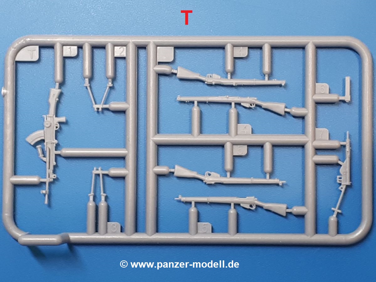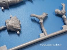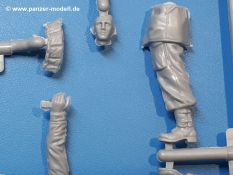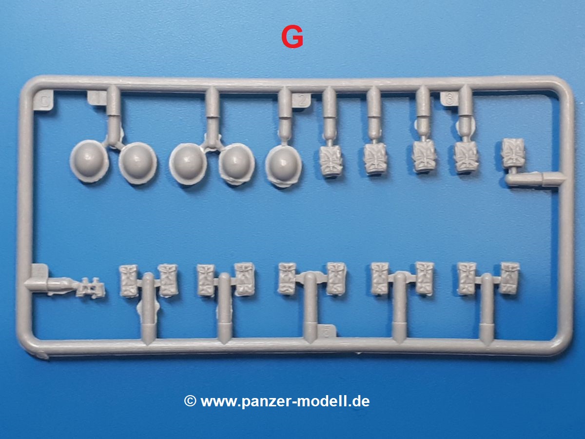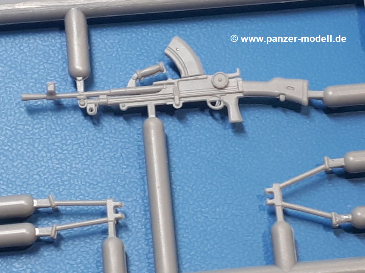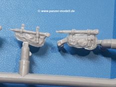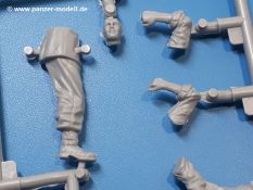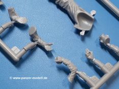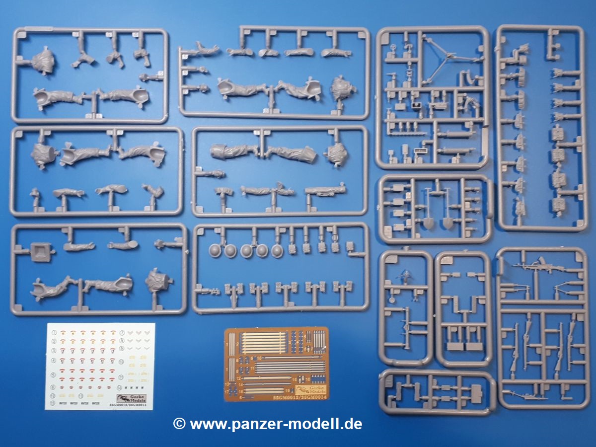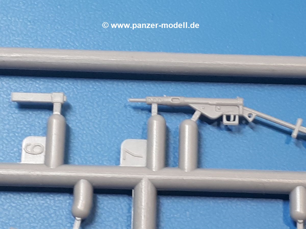 Die Teile sind sauber gespritzt, ohne Versatz und dicken Grat. Nur hier und da feiner Grat. Gesichter und Faltenwurf der Uniformen sind akzeptabel und für Spritzguss toll geworden. Viele Ausrüstungsgegenstände sind zur besseren Detaillierung mehrteilig ausgeführt, einige Details wie die Läufe der Waffen sind sehr filigran.Das Team besteht aus 5 Soldaten. Sie tragen Uniformen, wie sie im 2. Weltkrieg in Nord-Europa zum Einsatz kamen. Wer mitgezählt hat, konnte feststellen, dass es wesentlich mehr Arme als Soldaten gibt. Nein, das ist keine Spezialeinheit bestehend aus indischen Göttern, sondern Gecko Models ermöglicht für 4 der 5 Figuren je 2 Optionen.Dem Bausatz geschuldet ist der Mittelpunkt das Vickers-MG Kal. 0.303, das mit 2 verschiedenen Läufen gebaut werden kann. Die Laufmündungen sind natürlich bereits ausgehöhlt. Verschlussgehäuse, Handgriffe und Direktvisier sind separat vorhanden. Das dazugehörige, ausgeklappte Dreibein nimmt das MG-Lager mit Höhenstelleinrichtung auf und besteht aus insgesamt 6 Teilen. Ein Wasserkanister für die Kühlung, ein Gurtkasten und Munitionsgurt vervollständigen das Vickers. Anders als bei dem MG-Team im Einsatz werden die Teile auf die Soldaten aufgeteilt.Wer ist denn nun wer? Durch die vielen Optionen wird das nicht mehr so eindeutig. Beschreiben wir die Soldaten mal anhand der Spritzling-Nummern.Spritzling A: Option 1 stellt den, das ausgeklappte Dreibein auf den Schultern tragenden Soldaten dar. Seine Arme sind dabei lässig über die Beine des Gestells gelegt. Die Ärmel der Jacke sind hochgekrempelt. Auf dem Kopf trägt er den typischen Brodie-Helm (im deutschen auch Tellerhelm genannt). Vorn trägt er 2 große Magazintaschen, an der rechten Seite eine Feldflasche, an der linken 1 Ausrüstungstasche und hinten eine Tasche mit Grabwerkzeug. In der Option 2 trägt er das Bren-MG mit eingeklapptem Zweibein auf der linken Schulter, den Arm über den Lauf gelegt. Mit der rechten Hand hält er sich an einer Magazintasche fest. Helm und Ausrüstung wie in Option 1.Spritzling B: Auch hier gibt es 2 Optionen, aber in der Anleitung ist wohl etwas nicht ganz richtig, so dass ich bei der 2. Version etwas raten muss. Auf alle Fälle ist er derjenige, der das Vickers-MG trägt. Das MG liegt auf der rechten Schulter auf, die rechte Hand hält es am Bediengriff. Mit der linken Hand trägt er einen MG-Kasten. Seine Ausrüstung besteht natürlich aus dem Helm, dazu eine Feldflasche an der rechten Seite, 2 kleine Ausrüstungstaschen vorn am Koppel, eine große an der linken Seite. Dort finden wir auch einen Spaten, dessen Blatt an der linken Brust anliegt und der Stiel nach hinten links herausschaut. Auf dem Rücken trägt er einen Rucksack. Die 2. Option ist bis auf den rechten Arm gleich. Der rechte Arm hängt mit geöffneter Hand herunter. Ich rate mal, dass man ihm einen weiteren Gurtkasten oder einen Karabiner in die Hand geben könnte.Spritzling C: Der Munitionsträger ist der einzige ohne weitere Option. Er trägt in beiden Händen Munitionskästen und auf dem Rücken einen Munitionsrucksack. Vorn trägt er 2 große Magazintaschen, an der rechten Seite eine Feldflasche, an der linken 1 Ausrüstungstasche und hinten eine Tasche mit Grabwerkzeug. Selbstverständlich trägt auch er einen Brodie-Helm.Spritzling D: Ich möchte ihn mal den Sicherungsschützen nennen, denn er trägt entweder ein Bren-MG mit beiden Händen einsatzbereit vor dem Körper oder einen Karabiner in der rechten Hand. Seine Ausrüstung besteht in beiden Optionen aus Helm auf dem Kopf, Feldflasche an der rechten Seite, 2 großen Magazintaschen vorn, eine große Ausrüstungstasche an der linken Seite und einem Rucksack auf dem Rücken.Spritzling E: Hier haben wir, zumindest in der Version mit der Sten-MP, den Truppführer vor uns. Mit der rechten Hand hält er sich an einer Magazintasche fest, in der linken trägt er den Wasserkanister für die MG-Kühlung. Seine Ausrüstungsgegenstände sind Helm, 2 große Magazintaschen vorn, eine große Ausrüstungstasche an der linken Seite, ein Rucksack auf dem Rücken und die Tasche mit Grabwerkzeug. Vorn schräg über die Hüfte trägt er noch einen Gurt mehren Taschen. Alternativ trägt er dann als Truppführer die Sten-MP an der rechten Seite oder als Beobachter das Entfernungsmessgerät in seiner Schutztasche.Für die Stahlhelme, Taschen und Waffen gibt es Gurte aus PE-Material. Auch die Tragegriffe für den MG-Kasten und die Wasserkanister sind aus PE.Der Decalbogen hat Rangabzeichen vom Korporal bis zum Sergeanten anzubieten. Dazu kommen Beschriftungen für die Wasserkanister und Munitionskisten, MG-Schützenabzeichen und Einheitsabzeichen. Unter den Einheiten sind eindeutig zu erkennen die 11th Armoured Division (schwarzer Bulle in gelbem Feld), die 49th Infantry Brigade (Polarbär in schwarzem Feld) und die 53rd (Welsh) Infantry Division (rote Krone in braunem Feld).Die teils farbige Bauanleitung zeigt die gebauten Figuren mit den Nummern, wohin die Teile gehören. Die Bemalungshinweise sind pro Figur mittels Farbnamen angegeben. Anhand eines aufrecht gehenden Soldaten wird die Anbringung der Rang- und Einheitsabzeichen gezeigt. Der Zusammenbau von Munitionskisten, Wasserkanistern, Vickers-MG, Entfernungsmesser und Waffen erscheint in Extra-Bauschritten. Dies gilt auch für die Anbringung der PE-Gurte. Ein weiterer Schritt ist der Anbringung der Decals an Wasserkanistern und Munitionskisten gewidmet. Dort findet man auch die Farbangaben dazu, ebenso wie die Bemalung der Schaufel und der Tassen. Der letzte Schritt zeigt die Anbringung der PE-Gurte an Helm, Tasche und Fernglas-Etui sowie deren Bemalung.Nach dem MG-Team in Aktion ist dieser Satz auch hochwillkommen. Das Team befindet sich im aufrechten Gang beim Marsch fernab vom Feind. Aufgrund der vielen Figurenoptionen ist man mit 2-3 dieser Bausätze sicher gut bedient. Der Preis um die 16 EUR macht diese Figuren sicher noch attraktiver. Fans der britischen Armee ran an den S