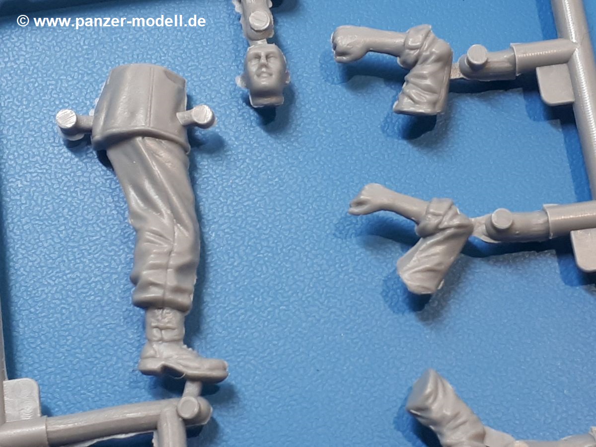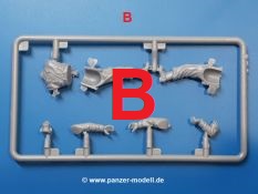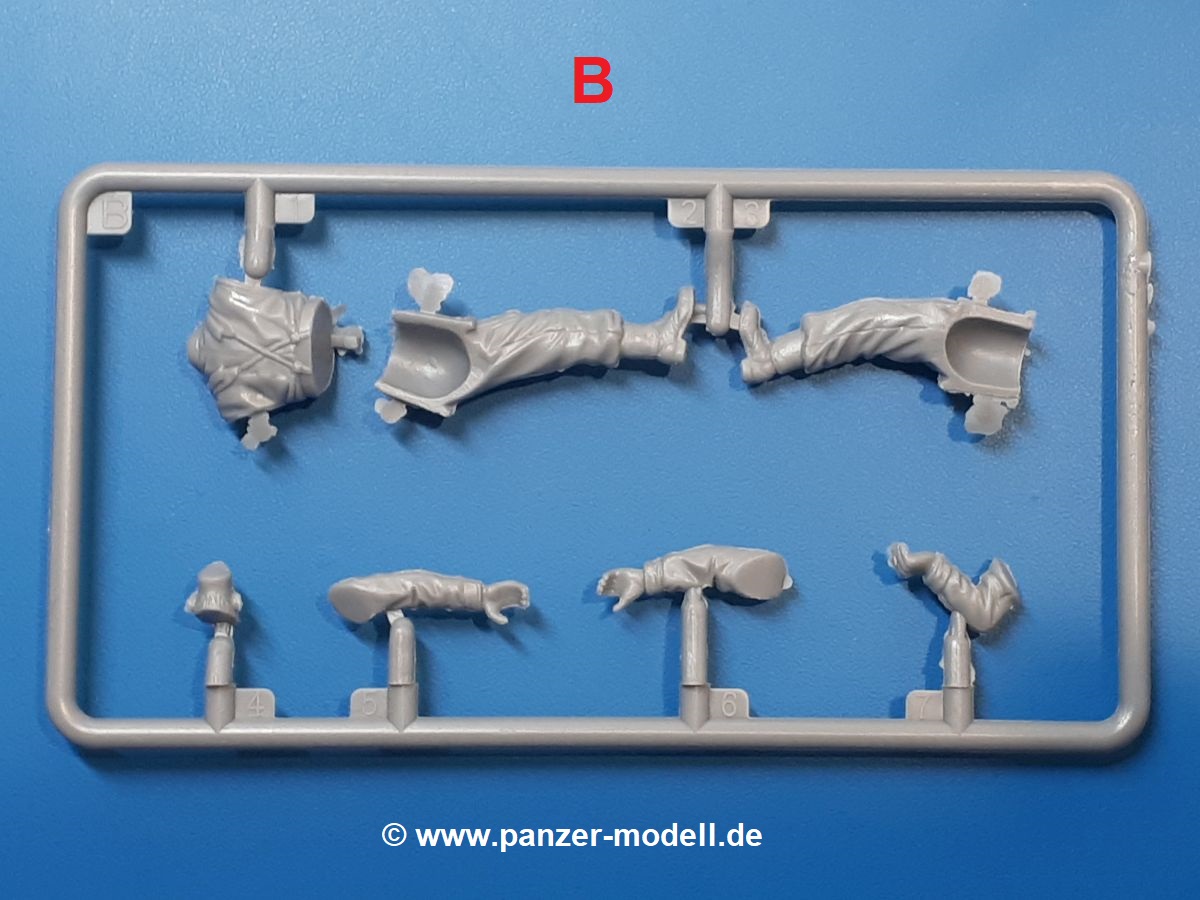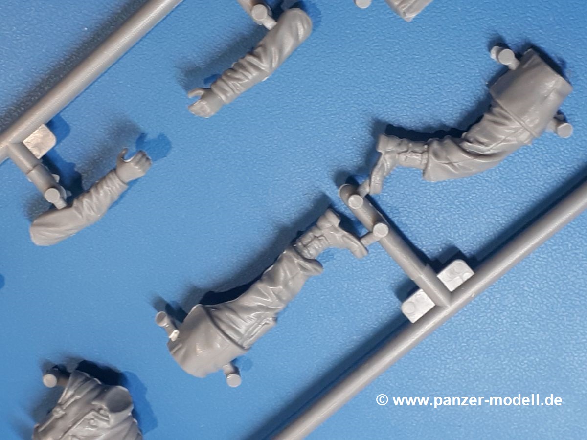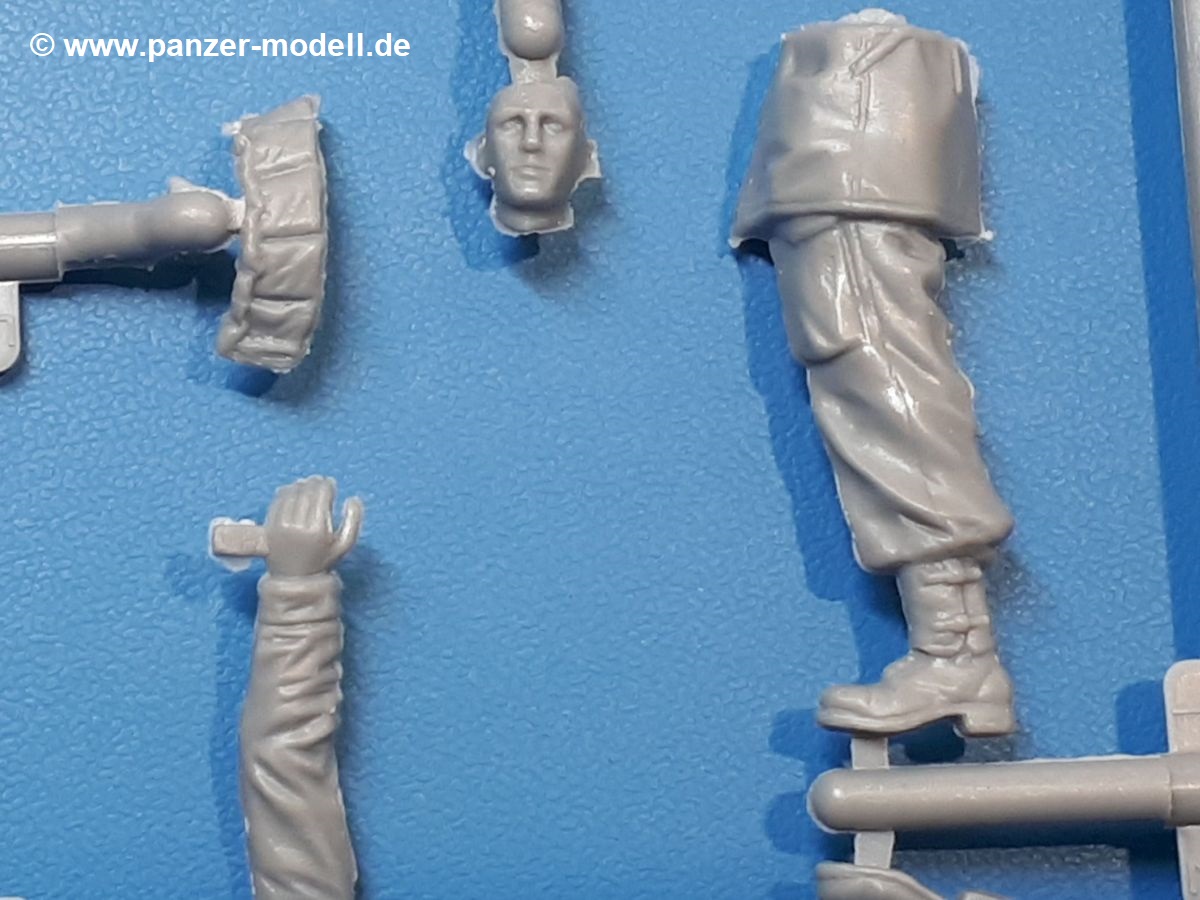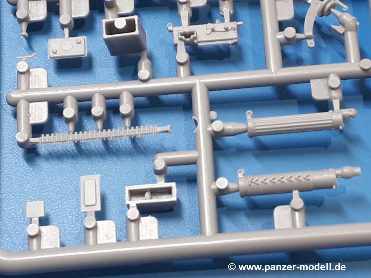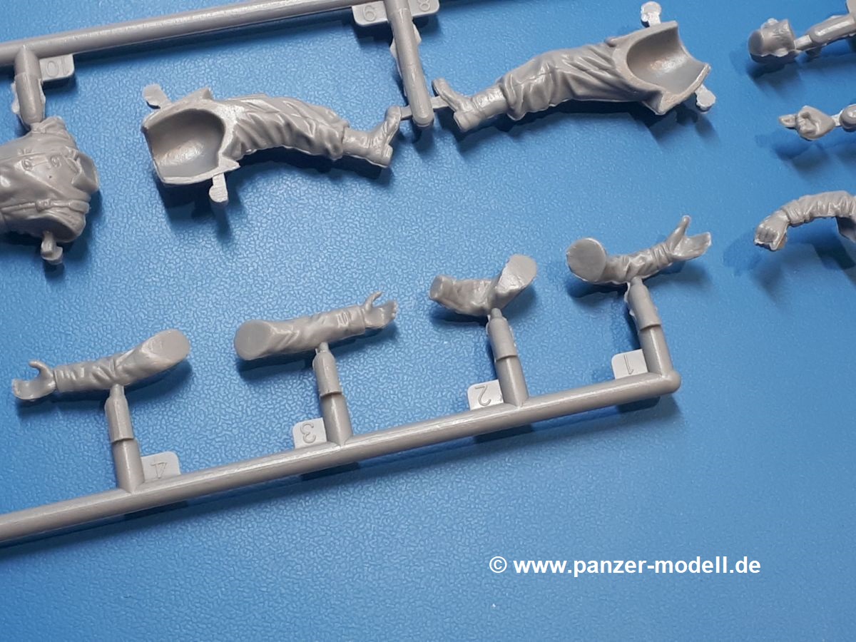 Die Teile sind sauber gespritzt, ohne Versatz und dicken Grat. Nur hier und da feiner Grat. Gesichter und Faltenwurf der Uniformen sind akzeptabel und für Spritzguss toll geworden. Viele Ausrüstungsgegenstände sind zur besseren Detaillierung mehrteilig ausgeführt, einige Details wie die Läufe der Waffen sind sehr filigran.Das Team besteht aus 5 Soldaten. Sie tragen Uniformen, wie sie im 2. Weltkrieg in Nord-Europa zum Einsatz kamen. Wer mitgezählt hat, konnte feststellen, dass es wesentlich mehr Arme als Soldaten gibt. Nein, das ist keine Spezialeinheit bestehend aus indischen Göttern, sondern Gecko Models ermöglicht für 4 der 5 Figuren je 2 Optionen.Dem Bausatz geschuldet ist der Mittelpunkt das Vickers-MG Kal. 0.303, das mit 2 verschiedenen Läufen gebaut werden kann. Die Laufmündungen sind natürlich bereits ausgehöhlt. Verschlussgehäuse, Handgriffe und Direktvisier sind separat vorhanden. Das dazugehörige, ausgeklappte Dreibein nimmt das MG-Lager mit Höhenstelleinrichtung auf und besteht aus insgesamt 6 Teilen. Ein Wasserkanister für die Kühlung, ein Gurtkasten und Munitionsgurt vervollständigen das Vickers. Anders als bei dem MG-Team im Einsatz werden die Teile auf die Soldaten aufgeteilt.Wer ist denn nun wer? Durch die vielen Optionen wird das nicht mehr so eindeutig. Beschreiben wir die Soldaten mal anhand der Spritzling-Nummern.Spritzling A: Option 1 stellt den, das ausgeklappte Dreibein auf den Schultern tragenden Soldaten dar. Seine Arme sind dabei lässig über die Beine des Gestells gelegt. Die Ärmel der Jacke sind hochgekrempelt. Auf dem Kopf trägt er den typischen Brodie-Helm (im deutschen auch Tellerhelm genannt). Vorn trägt er 2 große Magazintaschen, an der rechten Seite eine Feldflasche, an der linken 1 Ausrüstungstasche und hinten eine Tasche mit Grabwerkzeug. In der Option 2 trägt er das Bren-MG mit eingeklapptem Zweibein auf der linken Schulter, den Arm über den Lauf gelegt. Mit der rechten Hand hält er sich an einer Magazintasche fest. Helm und Ausrüstung wie in Option 1.Spritzling B: Auch hier gibt es 2 Optionen, aber in der Anleitung ist wohl etwas nicht ganz richtig, so dass ich bei der 2. Version etwas raten muss. Auf alle Fälle ist er derjenige, der das Vickers-MG trägt. Das MG liegt auf der rechten Schulter auf, die rechte Hand hält es am Bediengriff. Mit der linken Hand trägt er einen MG-Kasten. Seine Ausrüstung besteht natürlich aus dem Helm, dazu eine Feldflasche an der rechten Seite, 2 kleine Ausrüstungstaschen vorn am Koppel, eine große an der linken Seite. Dort finden wir auch einen Spaten, dessen Blatt an der linken Brust anliegt und der Stiel nach hinten links herausschaut. Auf dem Rücken trägt er einen Rucksack. Die 2. Option ist bis auf den rechten Arm gleich. Der rechte Arm hängt mit geöffneter Hand herunter. Ich rate mal, dass man ihm einen weiteren Gurtkasten oder einen Karabiner in die Hand geben könnte.Spritzling C: Der Munitionsträger ist der einzige ohne weitere Option. Er trägt in beiden Händen Munitionskästen und auf dem Rücken einen Munitionsrucksack. Vorn trägt er 2 große Magazintaschen, an der rechten Seite eine Feldflasche, an der linken 1 Ausrüstungstasche und hinten eine Tasche mit Grabwerkzeug. Selbstverständlich trägt auch er einen Brodie-Helm.Spritzling D: Ich möchte ihn mal den Sicherungsschützen nennen, denn er trägt entweder ein Bren-MG mit beiden Händen einsatzbereit vor dem Körper oder einen Karabiner in der rechten Hand. Seine Ausrüstung besteht in beiden Optionen aus Helm auf dem Kopf, Feldflasche an der rechten Seite, 2 großen Magazintaschen vorn, eine große Ausrüstungstasche an der linken Seite und einem Rucksack auf dem Rücken.Spritzling E: Hier haben wir, zumindest in der Version mit der Sten-MP, den Truppführer vor uns. Mit der rechten Hand hält er sich an einer Magazintasche fest, in der linken trägt er den Wasserkanister für die MG-Kühlung. Seine Ausrüstungsgegenstände sind Helm, 2 große Magazintaschen vorn, eine große Ausrüstungstasche an der linken Seite, ein Rucksack auf dem Rücken und die Tasche mit Grabwerkzeug. Vorn schräg über die Hüfte trägt er noch einen Gurt mehren Taschen. Alternativ trägt er dann als Truppführer die Sten-MP an der rechten Seite oder als Beobachter das Entfernungsmessgerät in seiner Schutztasche.Für die Stahlhelme, Taschen und Waffen gibt es Gurte aus PE-Material. Auch die Tragegriffe für den MG-Kasten und die Wasserkanister sind aus PE.Der Decalbogen hat Rangabzeichen vom Korporal bis zum Sergeanten anzubieten. Dazu kommen Beschriftungen für die Wasserkanister und Munitionskisten, MG-Schützenabzeichen und Einheitsabzeichen. Unter den Einheiten sind eindeutig zu erkennen die 11th Armoured Division (schwarzer Bulle in gelbem Feld), die 49th Infantry Brigade (Polarbär in schwarzem Feld) und die 53rd (Welsh) Infantry Division (rote Krone in braunem Feld).Die teils farbige Bauanleitung zeigt die gebauten Figuren mit den Nummern, wohin die Teile gehören. Die Bemalungshinweise sind pro Figur mittels Farbnamen angegeben. Anhand eines aufrecht gehenden Soldaten wird die Anbringung der Rang- und Einheitsabzeichen gezeigt. Der Zusammenbau von Munitionskisten, Wasserkanistern, Vickers-MG, Entfernungsmesser und Waffen erscheint in Extra-Bauschritten. Dies gilt auch für die Anbringung der PE-Gurte. Ein weiterer Schritt ist der Anbringung der Decals an Wasserkanistern und Munitionskisten gewidmet. Dort findet man auch die Farbangaben dazu, ebenso wie die Bemalung der Schaufel und der Tassen. Der letzte Schritt zeigt die Anbringung der PE-Gurte an Helm, Tasche und Fernglas-Etui sowie deren Bemalung.Nach dem MG-Team in Aktion ist dieser Satz auch hochwillkommen. Das Team befindet sich im aufrechten Gang beim Marsch fernab vom Feind. Aufgrund der vielen Figurenoptionen ist man mit 2-3 dieser Bausätze sicher gut bedient. Der Preis um die 16 EUR macht diese Figuren sicher noch attraktiver. Fans der britischen Armee ran an den S
