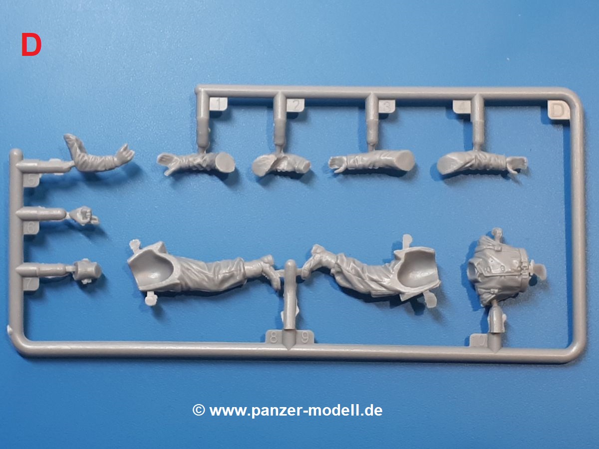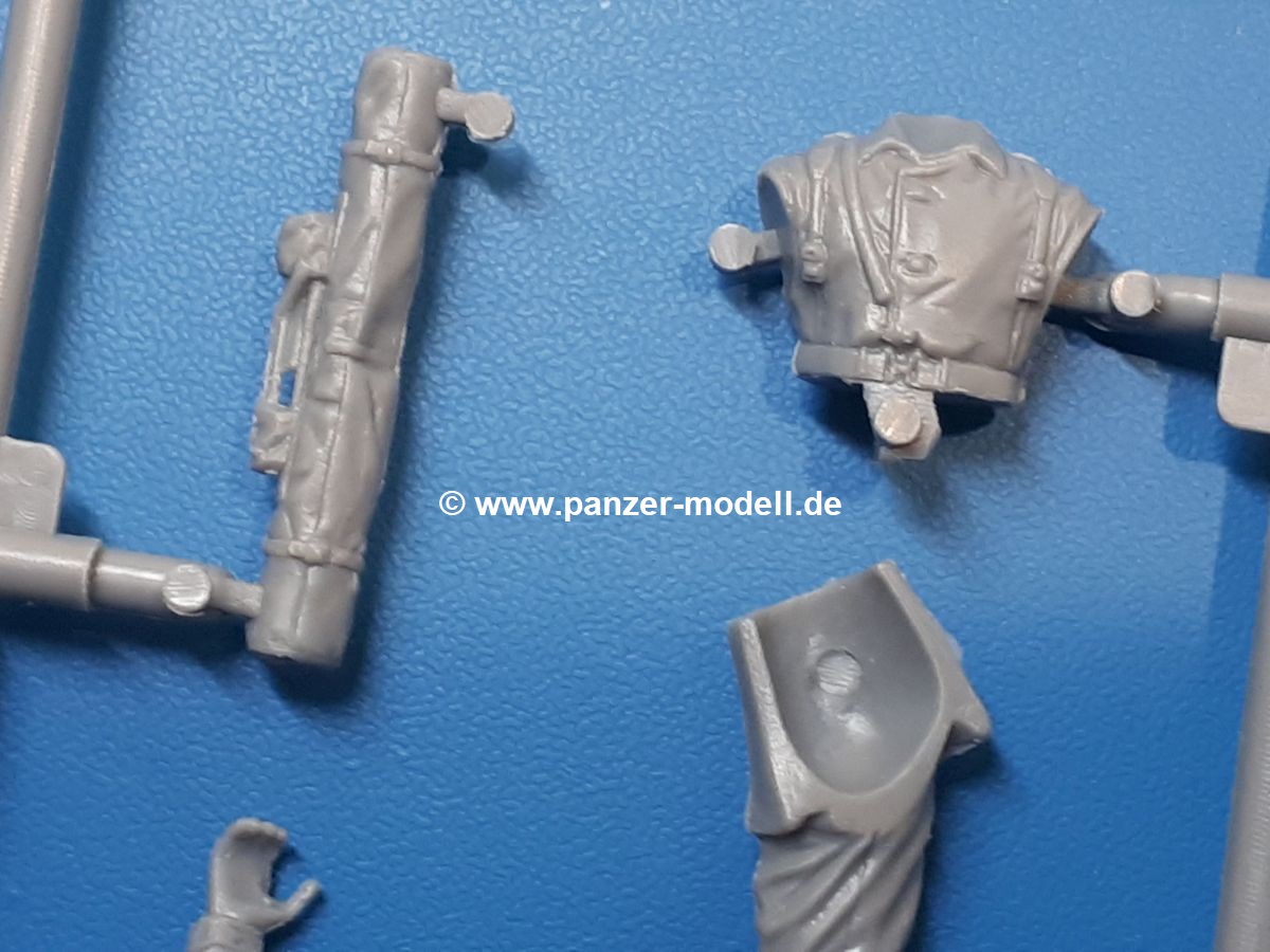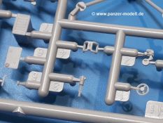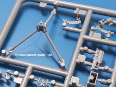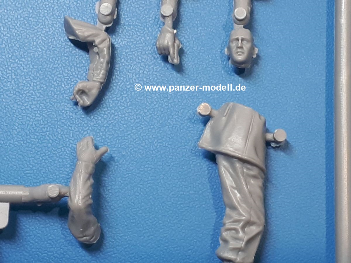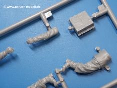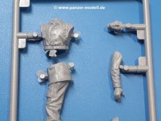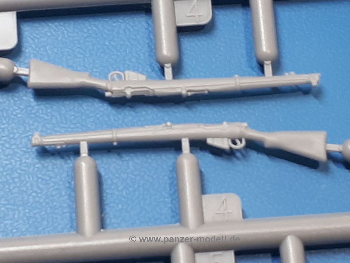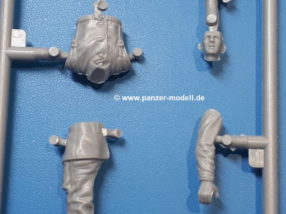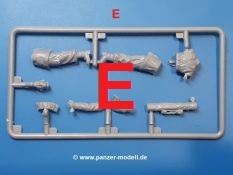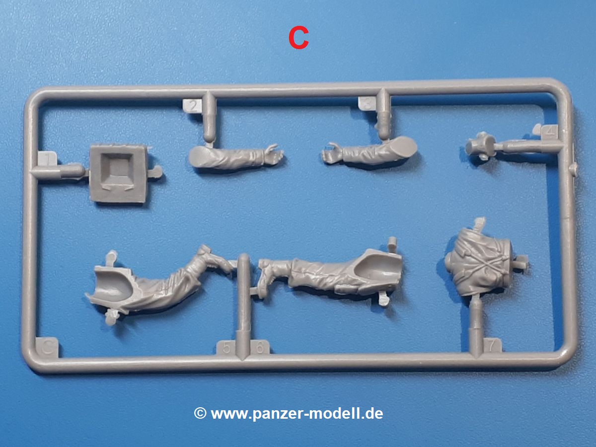 Die Teile sind sauber gespritzt, ohne Versatz und dicken Grat. Nur hier und da feiner Grat. Gesichter und Faltenwurf der Uniformen sind akzeptabel und für Spritzguss toll geworden. Viele Ausrüstungsgegenstände sind zur besseren Detaillierung mehrteilig ausgeführt, einige Details wie die Läufe der Waffen sind sehr filigran.Das Team besteht aus 5 Soldaten. Sie tragen Uniformen, wie sie im 2. Weltkrieg in Nord-Europa zum Einsatz kamen. Wer mitgezählt hat, konnte feststellen, dass es wesentlich mehr Arme als Soldaten gibt. Nein, das ist keine Spezialeinheit bestehend aus indischen Göttern, sondern Gecko Models ermöglicht für 4 der 5 Figuren je 2 Optionen.Dem Bausatz geschuldet ist der Mittelpunkt das Vickers-MG Kal. 0.303, das mit 2 verschiedenen Läufen gebaut werden kann. Die Laufmündungen sind natürlich bereits ausgehöhlt. Verschlussgehäuse, Handgriffe und Direktvisier sind separat vorhanden. Das dazugehörige, ausgeklappte Dreibein nimmt das MG-Lager mit Höhenstelleinrichtung auf und besteht aus insgesamt 6 Teilen. Ein Wasserkanister für die Kühlung, ein Gurtkasten und Munitionsgurt vervollständigen das Vickers. Anders als bei dem MG-Team im Einsatz werden die Teile auf die Soldaten aufgeteilt.Wer ist denn nun wer? Durch die vielen Optionen wird das nicht mehr so eindeutig. Beschreiben wir die Soldaten mal anhand der Spritzling-Nummern.Spritzling A: Option 1 stellt den, das ausgeklappte Dreibein auf den Schultern tragenden Soldaten dar. Seine Arme sind dabei lässig über die Beine des Gestells gelegt. Die Ärmel der Jacke sind hochgekrempelt. Auf dem Kopf trägt er den typischen Brodie-Helm (im deutschen auch Tellerhelm genannt). Vorn trägt er 2 große Magazintaschen, an der rechten Seite eine Feldflasche, an der linken 1 Ausrüstungstasche und hinten eine Tasche mit Grabwerkzeug. In der Option 2 trägt er das Bren-MG mit eingeklapptem Zweibein auf der linken Schulter, den Arm über den Lauf gelegt. Mit der rechten Hand hält er sich an einer Magazintasche fest. Helm und Ausrüstung wie in Option 1.Spritzling B: Auch hier gibt es 2 Optionen, aber in der Anleitung ist wohl etwas nicht ganz richtig, so dass ich bei der 2. Version etwas raten muss. Auf alle Fälle ist er derjenige, der das Vickers-MG trägt. Das MG liegt auf der rechten Schulter auf, die rechte Hand hält es am Bediengriff. Mit der linken Hand trägt er einen MG-Kasten. Seine Ausrüstung besteht natürlich aus dem Helm, dazu eine Feldflasche an der rechten Seite, 2 kleine Ausrüstungstaschen vorn am Koppel, eine große an der linken Seite. Dort finden wir auch einen Spaten, dessen Blatt an der linken Brust anliegt und der Stiel nach hinten links herausschaut. Auf dem Rücken trägt er einen Rucksack. Die 2. Option ist bis auf den rechten Arm gleich. Der rechte Arm hängt mit geöffneter Hand herunter. Ich rate mal, dass man ihm einen weiteren Gurtkasten oder einen Karabiner in die Hand geben könnte.Spritzling C: Der Munitionsträger ist der einzige ohne weitere Option. Er trägt in beiden Händen Munitionskästen und auf dem Rücken einen Munitionsrucksack. Vorn trägt er 2 große Magazintaschen, an der rechten Seite eine Feldflasche, an der linken 1 Ausrüstungstasche und hinten eine Tasche mit Grabwerkzeug. Selbstverständlich trägt auch er einen Brodie-Helm.Spritzling D: Ich möchte ihn mal den Sicherungsschützen nennen, denn er trägt entweder ein Bren-MG mit beiden Händen einsatzbereit vor dem Körper oder einen Karabiner in der rechten Hand. Seine Ausrüstung besteht in beiden Optionen aus Helm auf dem Kopf, Feldflasche an der rechten Seite, 2 großen Magazintaschen vorn, eine große Ausrüstungstasche an der linken Seite und einem Rucksack auf dem Rücken.Spritzling E: Hier haben wir, zumindest in der Version mit der Sten-MP, den Truppführer vor uns. Mit der rechten Hand hält er sich an einer Magazintasche fest, in der linken trägt er den Wasserkanister für die MG-Kühlung. Seine Ausrüstungsgegenstände sind Helm, 2 große Magazintaschen vorn, eine große Ausrüstungstasche an der linken Seite, ein Rucksack auf dem Rücken und die Tasche mit Grabwerkzeug. Vorn schräg über die Hüfte trägt er noch einen Gurt mehren Taschen. Alternativ trägt er dann als Truppführer die Sten-MP an der rechten Seite oder als Beobachter das Entfernungsmessgerät in seiner Schutztasche.Für die Stahlhelme, Taschen und Waffen gibt es Gurte aus PE-Material. Auch die Tragegriffe für den MG-Kasten und die Wasserkanister sind aus PE.Der Decalbogen hat Rangabzeichen vom Korporal bis zum Sergeanten anzubieten. Dazu kommen Beschriftungen für die Wasserkanister und Munitionskisten, MG-Schützenabzeichen und Einheitsabzeichen. Unter den Einheiten sind eindeutig zu erkennen die 11th Armoured Division (schwarzer Bulle in gelbem Feld), die 49th Infantry Brigade (Polarbär in schwarzem Feld) und die 53rd (Welsh) Infantry Division (rote Krone in braunem Feld).Die teils farbige Bauanleitung zeigt die gebauten Figuren mit den Nummern, wohin die Teile gehören. Die Bemalungshinweise sind pro Figur mittels Farbnamen angegeben. Anhand eines aufrecht gehenden Soldaten wird die Anbringung der Rang- und Einheitsabzeichen gezeigt. Der Zusammenbau von Munitionskisten, Wasserkanistern, Vickers-MG, Entfernungsmesser und Waffen erscheint in Extra-Bauschritten. Dies gilt auch für die Anbringung der PE-Gurte. Ein weiterer Schritt ist der Anbringung der Decals an Wasserkanistern und Munitionskisten gewidmet. Dort findet man auch die Farbangaben dazu, ebenso wie die Bemalung der Schaufel und der Tassen. Der letzte Schritt zeigt die Anbringung der PE-Gurte an Helm, Tasche und Fernglas-Etui sowie deren Bemalung.Nach dem MG-Team in Aktion ist dieser Satz auch hochwillkommen. Das Team befindet sich im aufrechten Gang beim Marsch fernab vom Feind. Aufgrund der vielen Figurenoptionen ist man mit 2-3 dieser Bausätze sicher gut bedient. Der Preis um die 16 EUR macht diese Figuren sicher noch attraktiver. Fans der britischen Armee ran an den S