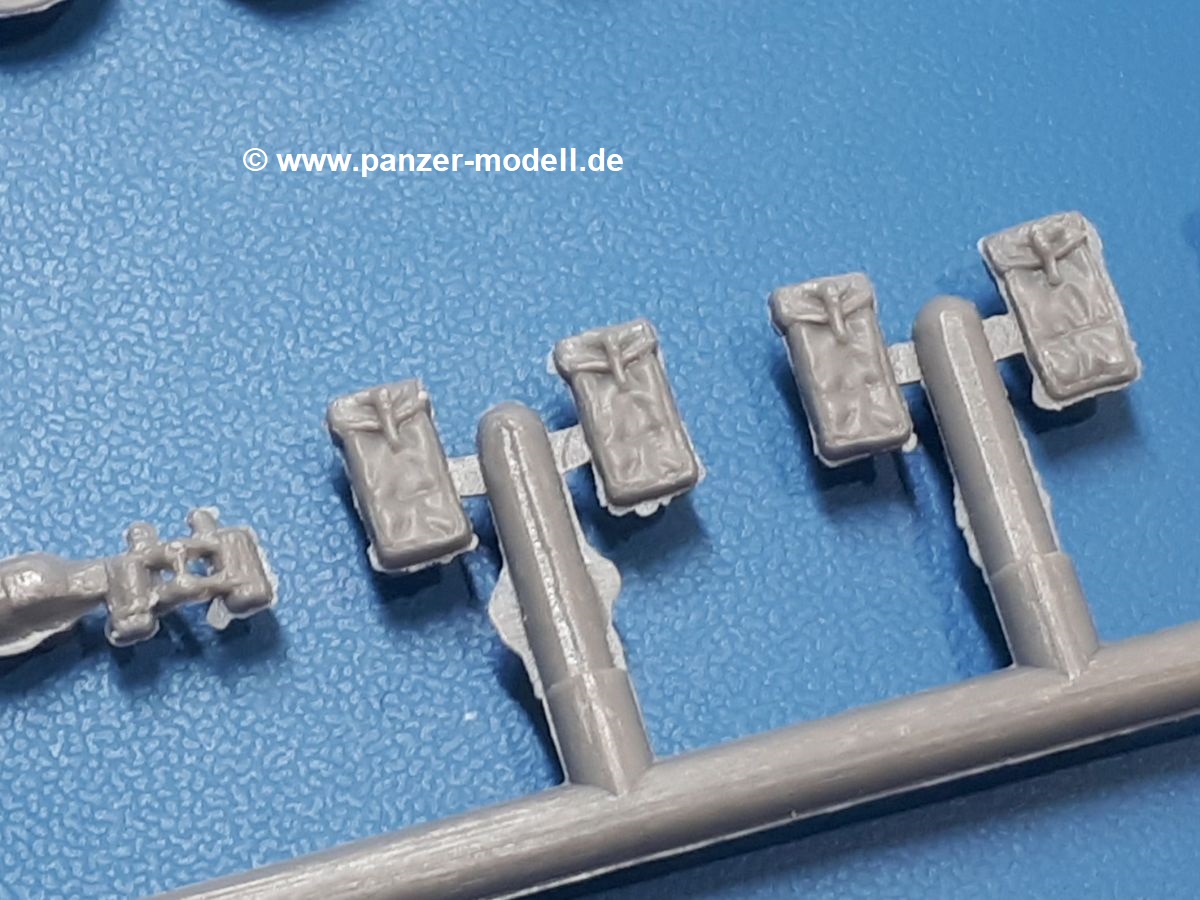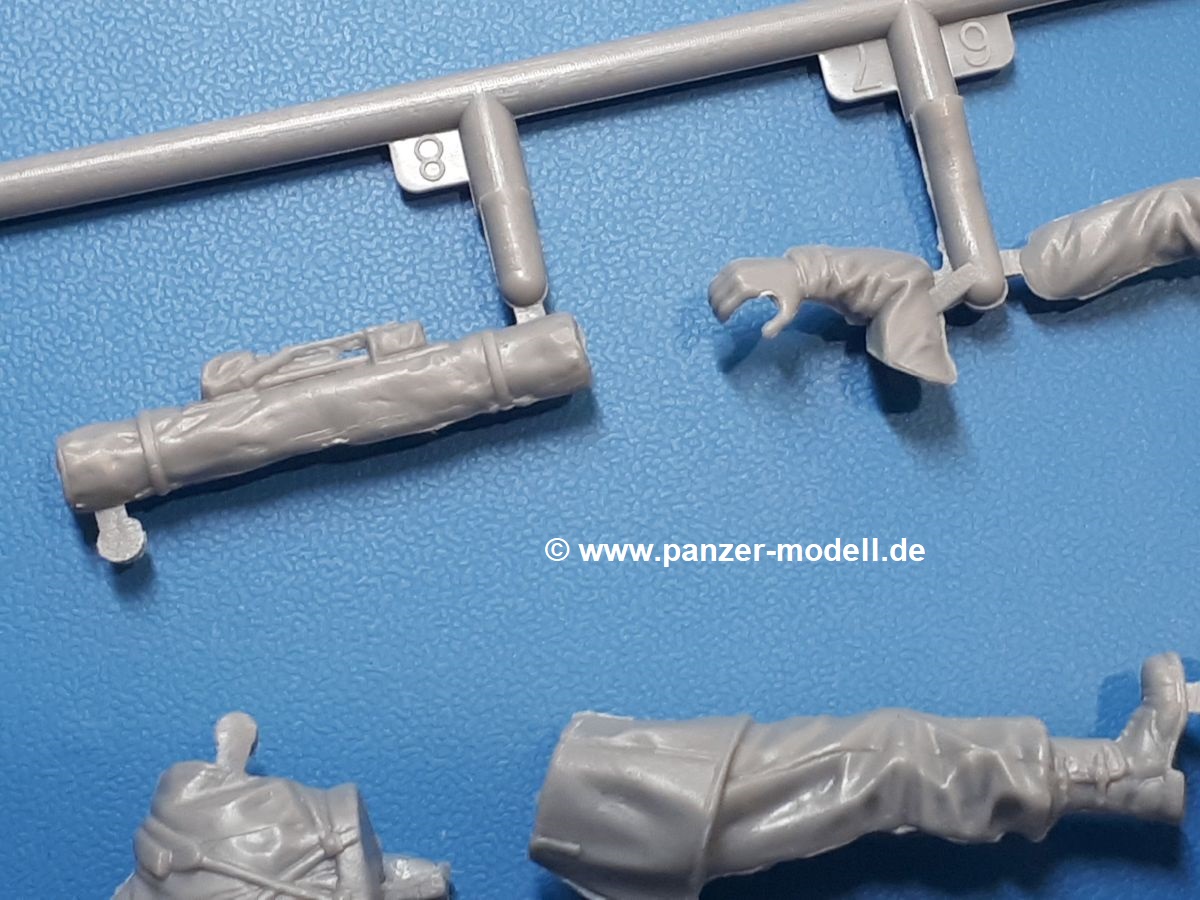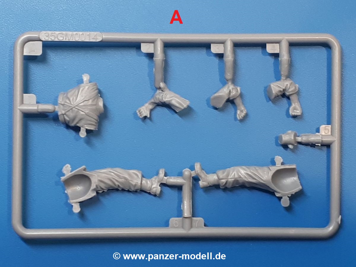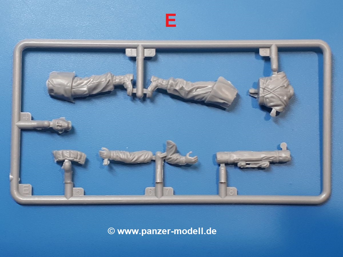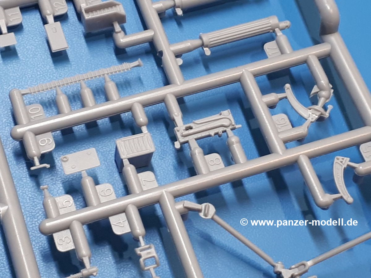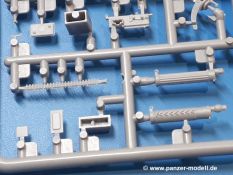 Die Teile sind sauber gespritzt, ohne Versatz und dicken Grat. Nur hier und da feiner Grat. Gesichter und Faltenwurf der Uniformen sind akzeptabel und für Spritzguss toll geworden. Viele Ausrüstungsgegenstände sind zur besseren Detaillierung mehrteilig ausgeführt, einige Details wie die Läufe der Waffen sind sehr filigran.Das Team besteht aus 5 Soldaten. Sie tragen Uniformen, wie sie im 2. Weltkrieg in Nord-Europa zum Einsatz kamen. Wer mitgezählt hat, konnte feststellen, dass es wesentlich mehr Arme als Soldaten gibt. Nein, das ist keine Spezialeinheit bestehend aus indischen Göttern, sondern Gecko Models ermöglicht für 4 der 5 Figuren je 2 Optionen.Dem Bausatz geschuldet ist der Mittelpunkt das Vickers-MG Kal. 0.303, das mit 2 verschiedenen Läufen gebaut werden kann. Die Laufmündungen sind natürlich bereits ausgehöhlt. Verschlussgehäuse, Handgriffe und Direktvisier sind separat vorhanden. Das dazugehörige, ausgeklappte Dreibein nimmt das MG-Lager mit Höhenstelleinrichtung auf und besteht aus insgesamt 6 Teilen. Ein Wasserkanister für die Kühlung, ein Gurtkasten und Munitionsgurt vervollständigen das Vickers. Anders als bei dem MG-Team im Einsatz werden die Teile auf die Soldaten aufgeteilt.Wer ist denn nun wer? Durch die vielen Optionen wird das nicht mehr so eindeutig. Beschreiben wir die Soldaten mal anhand der Spritzling-Nummern.Spritzling A: Option 1 stellt den, das ausgeklappte Dreibein auf den Schultern tragenden Soldaten dar. Seine Arme sind dabei lässig über die Beine des Gestells gelegt. Die Ärmel der Jacke sind hochgekrempelt. Auf dem Kopf trägt er den typischen Brodie-Helm (im deutschen auch Tellerhelm genannt). Vorn trägt er 2 große Magazintaschen, an der rechten Seite eine Feldflasche, an der linken 1 Ausrüstungstasche und hinten eine Tasche mit Grabwerkzeug. In der Option 2 trägt er das Bren-MG mit eingeklapptem Zweibein auf der linken Schulter, den Arm über den Lauf gelegt. Mit der rechten Hand hält er sich an einer Magazintasche fest. Helm und Ausrüstung wie in Option 1.Spritzling B: Auch hier gibt es 2 Optionen, aber in der Anleitung ist wohl etwas nicht ganz richtig, so dass ich bei der 2. Version etwas raten muss. Auf alle Fälle ist er derjenige, der das Vickers-MG trägt. Das MG liegt auf der rechten Schulter auf, die rechte Hand hält es am Bediengriff. Mit der linken Hand trägt er einen MG-Kasten. Seine Ausrüstung besteht natürlich aus dem Helm, dazu eine Feldflasche an der rechten Seite, 2 kleine Ausrüstungstaschen vorn am Koppel, eine große an der linken Seite. Dort finden wir auch einen Spaten, dessen Blatt an der linken Brust anliegt und der Stiel nach hinten links herausschaut. Auf dem Rücken trägt er einen Rucksack. Die 2. Option ist bis auf den rechten Arm gleich. Der rechte Arm hängt mit geöffneter Hand herunter. Ich rate mal, dass man ihm einen weiteren Gurtkasten oder einen Karabiner in die Hand geben könnte.Spritzling C: Der Munitionsträger ist der einzige ohne weitere Option. Er trägt in beiden Händen Munitionskästen und auf dem Rücken einen Munitionsrucksack. Vorn trägt er 2 große Magazintaschen, an der rechten Seite eine Feldflasche, an der linken 1 Ausrüstungstasche und hinten eine Tasche mit Grabwerkzeug. Selbstverständlich trägt auch er einen Brodie-Helm.Spritzling D: Ich möchte ihn mal den Sicherungsschützen nennen, denn er trägt entweder ein Bren-MG mit beiden Händen einsatzbereit vor dem Körper oder einen Karabiner in der rechten Hand. Seine Ausrüstung besteht in beiden Optionen aus Helm auf dem Kopf, Feldflasche an der rechten Seite, 2 großen Magazintaschen vorn, eine große Ausrüstungstasche an der linken Seite und einem Rucksack auf dem Rücken.Spritzling E: Hier haben wir, zumindest in der Version mit der Sten-MP, den Truppführer vor uns. Mit der rechten Hand hält er sich an einer Magazintasche fest, in der linken trägt er den Wasserkanister für die MG-Kühlung. Seine Ausrüstungsgegenstände sind Helm, 2 große Magazintaschen vorn, eine große Ausrüstungstasche an der linken Seite, ein Rucksack auf dem Rücken und die Tasche mit Grabwerkzeug. Vorn schräg über die Hüfte trägt er noch einen Gurt mehren Taschen. Alternativ trägt er dann als Truppführer die Sten-MP an der rechten Seite oder als Beobachter das Entfernungsmessgerät in seiner Schutztasche.Für die Stahlhelme, Taschen und Waffen gibt es Gurte aus PE-Material. Auch die Tragegriffe für den MG-Kasten und die Wasserkanister sind aus PE.Der Decalbogen hat Rangabzeichen vom Korporal bis zum Sergeanten anzubieten. Dazu kommen Beschriftungen für die Wasserkanister und Munitionskisten, MG-Schützenabzeichen und Einheitsabzeichen. Unter den Einheiten sind eindeutig zu erkennen die 11th Armoured Division (schwarzer Bulle in gelbem Feld), die 49th Infantry Brigade (Polarbär in schwarzem Feld) und die 53rd (Welsh) Infantry Division (rote Krone in braunem Feld).Die teils farbige Bauanleitung zeigt die gebauten Figuren mit den Nummern, wohin die Teile gehören. Die Bemalungshinweise sind pro Figur mittels Farbnamen angegeben. Anhand eines aufrecht gehenden Soldaten wird die Anbringung der Rang- und Einheitsabzeichen gezeigt. Der Zusammenbau von Munitionskisten, Wasserkanistern, Vickers-MG, Entfernungsmesser und Waffen erscheint in Extra-Bauschritten. Dies gilt auch für die Anbringung der PE-Gurte. Ein weiterer Schritt ist der Anbringung der Decals an Wasserkanistern und Munitionskisten gewidmet. Dort findet man auch die Farbangaben dazu, ebenso wie die Bemalung der Schaufel und der Tassen. Der letzte Schritt zeigt die Anbringung der PE-Gurte an Helm, Tasche und Fernglas-Etui sowie deren Bemalung.Nach dem MG-Team in Aktion ist dieser Satz auch hochwillkommen. Das Team befindet sich im aufrechten Gang beim Marsch fernab vom Feind. Aufgrund der vielen Figurenoptionen ist man mit 2-3 dieser Bausätze sicher gut bedient. Der Preis um die 16 EUR macht diese Figuren sicher noch attraktiver. Fans der britischen Armee ran an den S