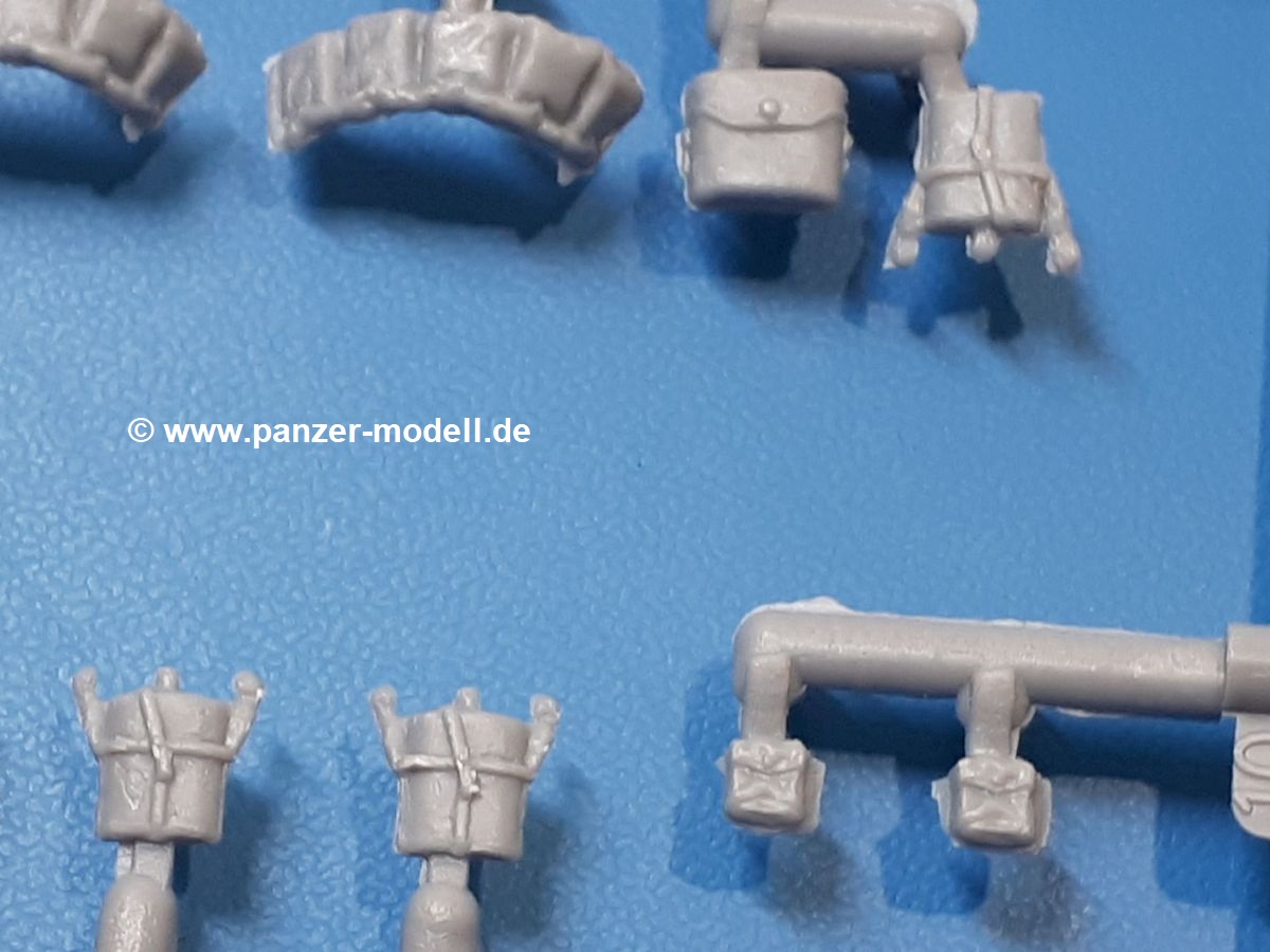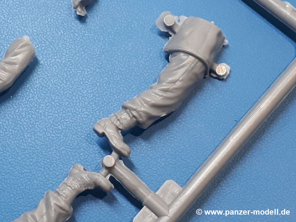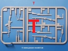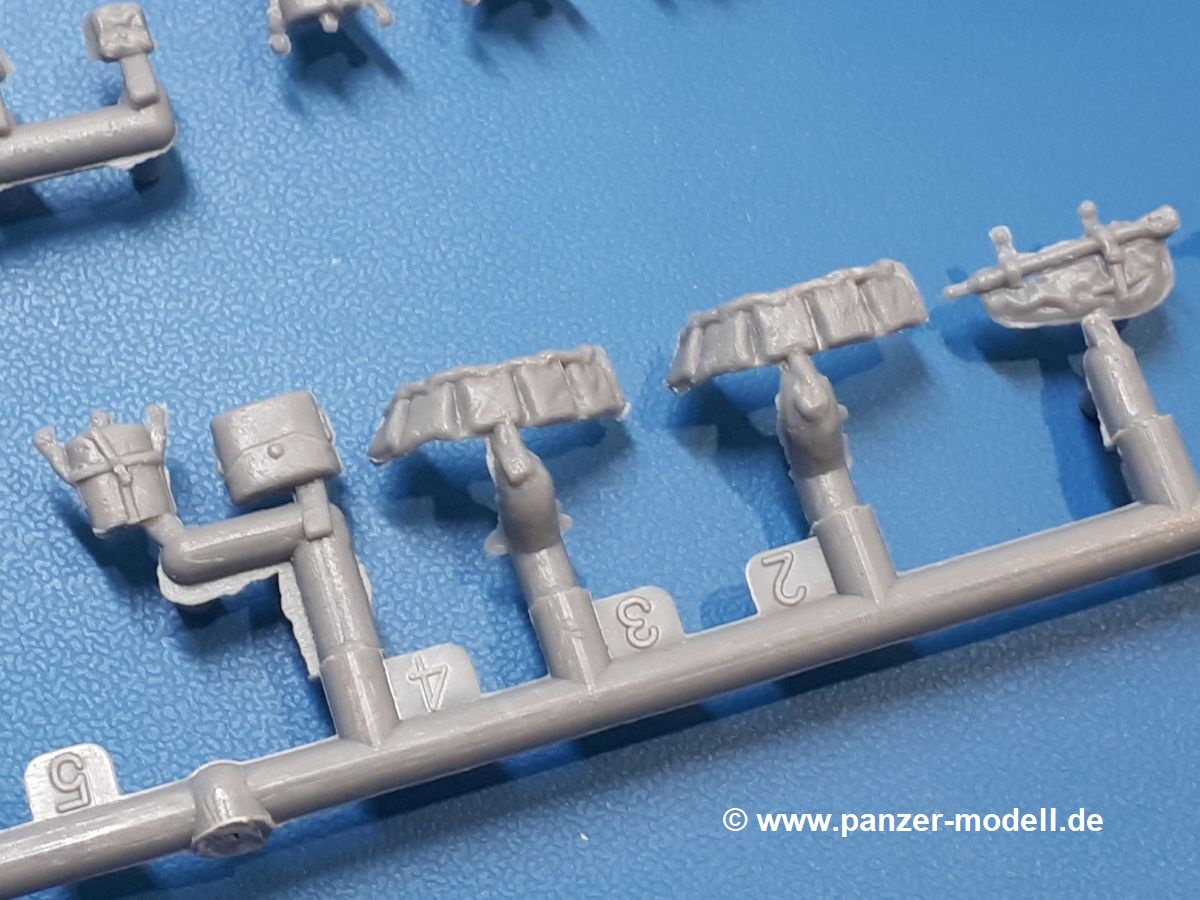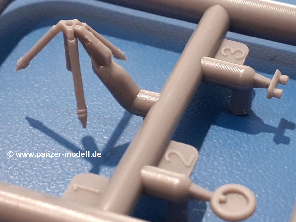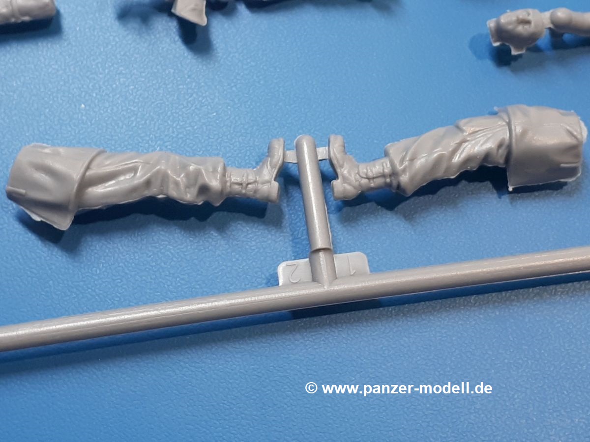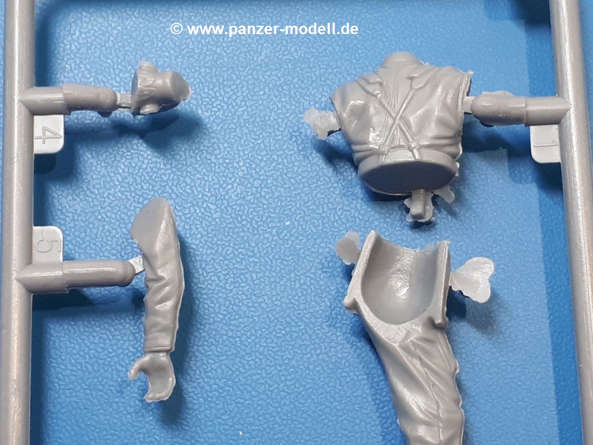 Die Teile sind sauber gespritzt, ohne Versatz und dicken Grat. Nur hier und da feiner Grat. Gesichter und Faltenwurf der Uniformen sind akzeptabel und für Spritzguss toll geworden. Viele Ausrüstungsgegenstände sind zur besseren Detaillierung mehrteilig ausgeführt, einige Details wie die Läufe der Waffen sind sehr filigran.Das Team besteht aus 5 Soldaten. Sie tragen Uniformen, wie sie im 2. Weltkrieg in Nord-Europa zum Einsatz kamen. Wer mitgezählt hat, konnte feststellen, dass es wesentlich mehr Arme als Soldaten gibt. Nein, das ist keine Spezialeinheit bestehend aus indischen Göttern, sondern Gecko Models ermöglicht für 4 der 5 Figuren je 2 Optionen.Dem Bausatz geschuldet ist der Mittelpunkt das Vickers-MG Kal. 0.303, das mit 2 verschiedenen Läufen gebaut werden kann. Die Laufmündungen sind natürlich bereits ausgehöhlt. Verschlussgehäuse, Handgriffe und Direktvisier sind separat vorhanden. Das dazugehörige, ausgeklappte Dreibein nimmt das MG-Lager mit Höhenstelleinrichtung auf und besteht aus insgesamt 6 Teilen. Ein Wasserkanister für die Kühlung, ein Gurtkasten und Munitionsgurt vervollständigen das Vickers. Anders als bei dem MG-Team im Einsatz werden die Teile auf die Soldaten aufgeteilt.Wer ist denn nun wer? Durch die vielen Optionen wird das nicht mehr so eindeutig. Beschreiben wir die Soldaten mal anhand der Spritzling-Nummern.Spritzling A: Option 1 stellt den, das ausgeklappte Dreibein auf den Schultern tragenden Soldaten dar. Seine Arme sind dabei lässig über die Beine des Gestells gelegt. Die Ärmel der Jacke sind hochgekrempelt. Auf dem Kopf trägt er den typischen Brodie-Helm (im deutschen auch Tellerhelm genannt). Vorn trägt er 2 große Magazintaschen, an der rechten Seite eine Feldflasche, an der linken 1 Ausrüstungstasche und hinten eine Tasche mit Grabwerkzeug. In der Option 2 trägt er das Bren-MG mit eingeklapptem Zweibein auf der linken Schulter, den Arm über den Lauf gelegt. Mit der rechten Hand hält er sich an einer Magazintasche fest. Helm und Ausrüstung wie in Option 1.Spritzling B: Auch hier gibt es 2 Optionen, aber in der Anleitung ist wohl etwas nicht ganz richtig, so dass ich bei der 2. Version etwas raten muss. Auf alle Fälle ist er derjenige, der das Vickers-MG trägt. Das MG liegt auf der rechten Schulter auf, die rechte Hand hält es am Bediengriff. Mit der linken Hand trägt er einen MG-Kasten. Seine Ausrüstung besteht natürlich aus dem Helm, dazu eine Feldflasche an der rechten Seite, 2 kleine Ausrüstungstaschen vorn am Koppel, eine große an der linken Seite. Dort finden wir auch einen Spaten, dessen Blatt an der linken Brust anliegt und der Stiel nach hinten links herausschaut. Auf dem Rücken trägt er einen Rucksack. Die 2. Option ist bis auf den rechten Arm gleich. Der rechte Arm hängt mit geöffneter Hand herunter. Ich rate mal, dass man ihm einen weiteren Gurtkasten oder einen Karabiner in die Hand geben könnte.Spritzling C: Der Munitionsträger ist der einzige ohne weitere Option. Er trägt in beiden Händen Munitionskästen und auf dem Rücken einen Munitionsrucksack. Vorn trägt er 2 große Magazintaschen, an der rechten Seite eine Feldflasche, an der linken 1 Ausrüstungstasche und hinten eine Tasche mit Grabwerkzeug. Selbstverständlich trägt auch er einen Brodie-Helm.Spritzling D: Ich möchte ihn mal den Sicherungsschützen nennen, denn er trägt entweder ein Bren-MG mit beiden Händen einsatzbereit vor dem Körper oder einen Karabiner in der rechten Hand. Seine Ausrüstung besteht in beiden Optionen aus Helm auf dem Kopf, Feldflasche an der rechten Seite, 2 großen Magazintaschen vorn, eine große Ausrüstungstasche an der linken Seite und einem Rucksack auf dem Rücken.Spritzling E: Hier haben wir, zumindest in der Version mit der Sten-MP, den Truppführer vor uns. Mit der rechten Hand hält er sich an einer Magazintasche fest, in der linken trägt er den Wasserkanister für die MG-Kühlung. Seine Ausrüstungsgegenstände sind Helm, 2 große Magazintaschen vorn, eine große Ausrüstungstasche an der linken Seite, ein Rucksack auf dem Rücken und die Tasche mit Grabwerkzeug. Vorn schräg über die Hüfte trägt er noch einen Gurt mehren Taschen. Alternativ trägt er dann als Truppführer die Sten-MP an der rechten Seite oder als Beobachter das Entfernungsmessgerät in seiner Schutztasche.Für die Stahlhelme, Taschen und Waffen gibt es Gurte aus PE-Material. Auch die Tragegriffe für den MG-Kasten und die Wasserkanister sind aus PE.Der Decalbogen hat Rangabzeichen vom Korporal bis zum Sergeanten anzubieten. Dazu kommen Beschriftungen für die Wasserkanister und Munitionskisten, MG-Schützenabzeichen und Einheitsabzeichen. Unter den Einheiten sind eindeutig zu erkennen die 11th Armoured Division (schwarzer Bulle in gelbem Feld), die 49th Infantry Brigade (Polarbär in schwarzem Feld) und die 53rd (Welsh) Infantry Division (rote Krone in braunem Feld).Die teils farbige Bauanleitung zeigt die gebauten Figuren mit den Nummern, wohin die Teile gehören. Die Bemalungshinweise sind pro Figur mittels Farbnamen angegeben. Anhand eines aufrecht gehenden Soldaten wird die Anbringung der Rang- und Einheitsabzeichen gezeigt. Der Zusammenbau von Munitionskisten, Wasserkanistern, Vickers-MG, Entfernungsmesser und Waffen erscheint in Extra-Bauschritten. Dies gilt auch für die Anbringung der PE-Gurte. Ein weiterer Schritt ist der Anbringung der Decals an Wasserkanistern und Munitionskisten gewidmet. Dort findet man auch die Farbangaben dazu, ebenso wie die Bemalung der Schaufel und der Tassen. Der letzte Schritt zeigt die Anbringung der PE-Gurte an Helm, Tasche und Fernglas-Etui sowie deren Bemalung.Nach dem MG-Team in Aktion ist dieser Satz auch hochwillkommen. Das Team befindet sich im aufrechten Gang beim Marsch fernab vom Feind. Aufgrund der vielen Figurenoptionen ist man mit 2-3 dieser Bausätze sicher gut bedient. Der Preis um die 16 EUR macht diese Figuren sicher noch attraktiver. Fans der britischen Armee ran an den S