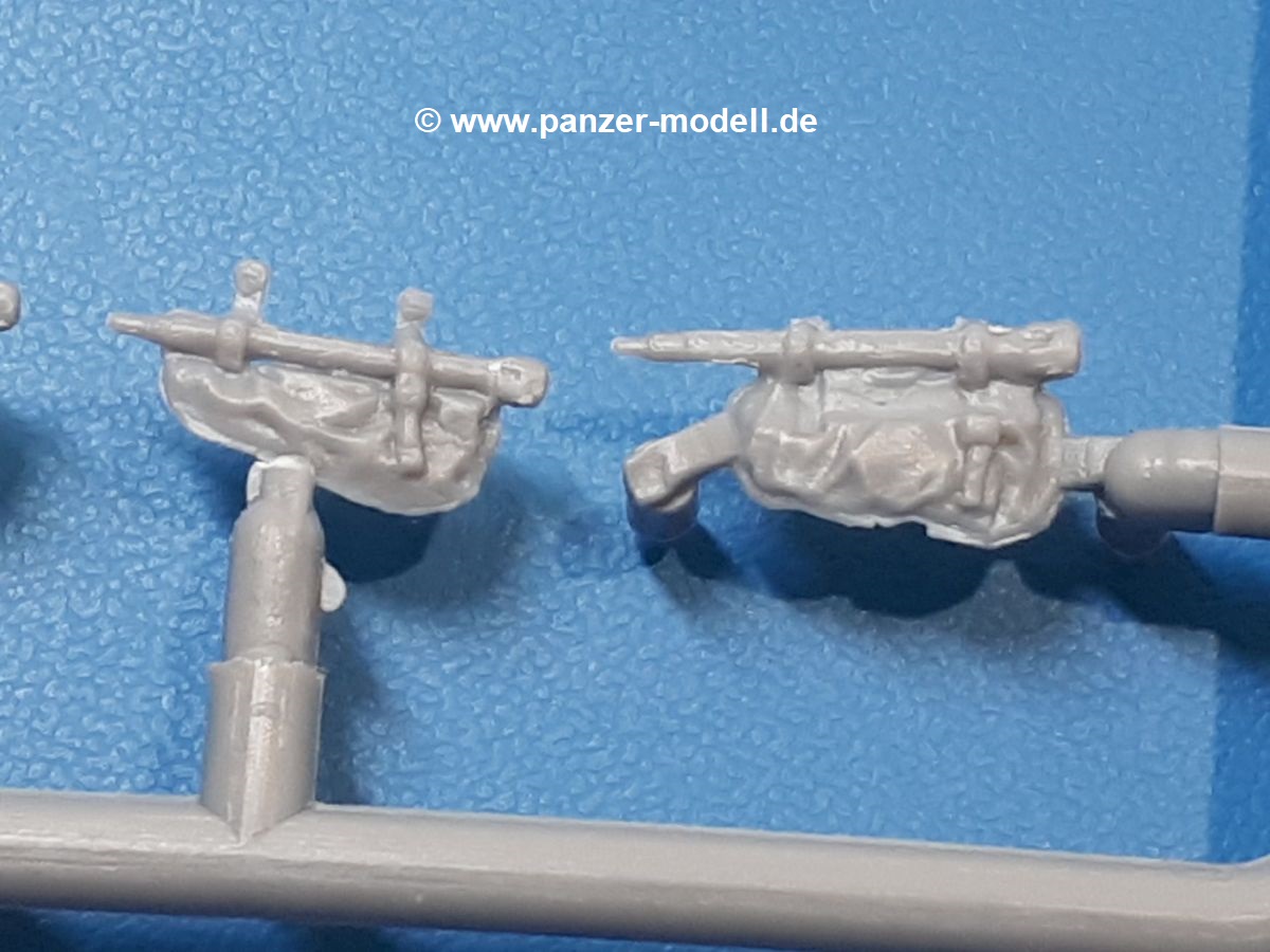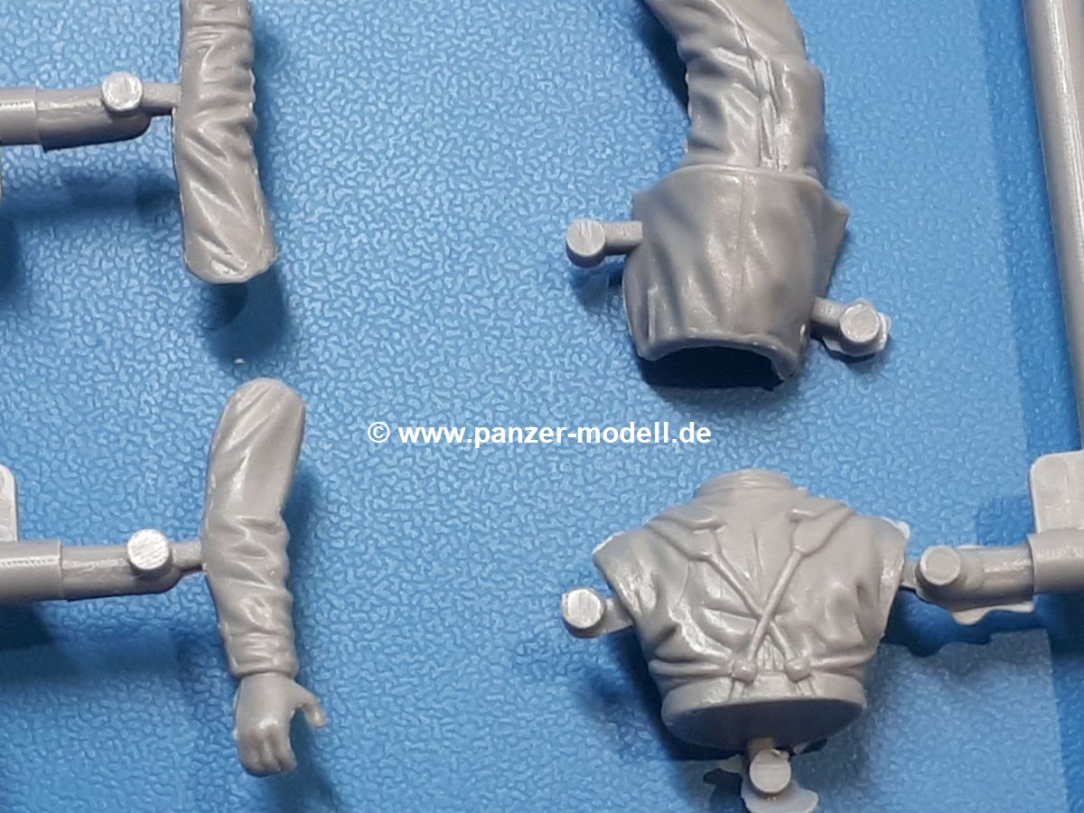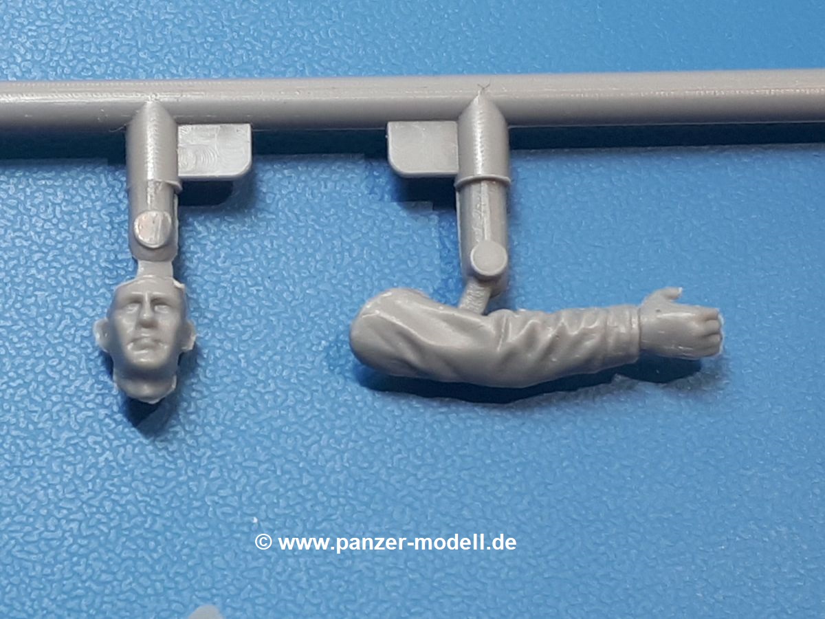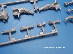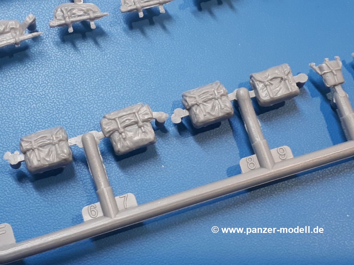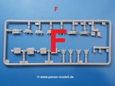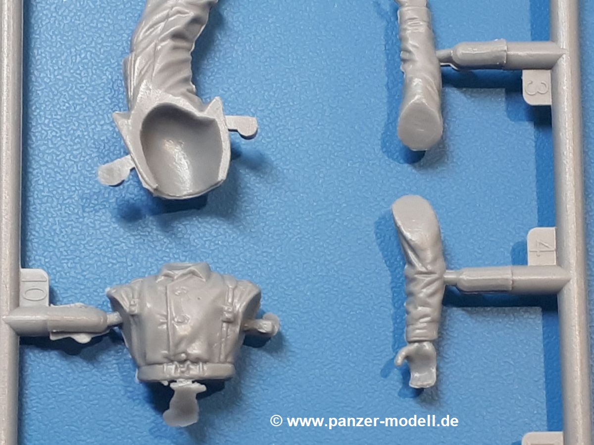 Die Teile sind sauber gespritzt, ohne Versatz und dicken Grat. Nur hier und da feiner Grat. Gesichter und Faltenwurf der Uniformen sind akzeptabel und für Spritzguss toll geworden. Viele Ausrüstungsgegenstände sind zur besseren Detaillierung mehrteilig ausgeführt, einige Details wie die Läufe der Waffen sind sehr filigran.Das Team besteht aus 5 Soldaten. Sie tragen Uniformen, wie sie im 2. Weltkrieg in Nord-Europa zum Einsatz kamen. Wer mitgezählt hat, konnte feststellen, dass es wesentlich mehr Arme als Soldaten gibt. Nein, das ist keine Spezialeinheit bestehend aus indischen Göttern, sondern Gecko Models ermöglicht für 4 der 5 Figuren je 2 Optionen.Dem Bausatz geschuldet ist der Mittelpunkt das Vickers-MG Kal. 0.303, das mit 2 verschiedenen Läufen gebaut werden kann. Die Laufmündungen sind natürlich bereits ausgehöhlt. Verschlussgehäuse, Handgriffe und Direktvisier sind separat vorhanden. Das dazugehörige, ausgeklappte Dreibein nimmt das MG-Lager mit Höhenstelleinrichtung auf und besteht aus insgesamt 6 Teilen. Ein Wasserkanister für die Kühlung, ein Gurtkasten und Munitionsgurt vervollständigen das Vickers. Anders als bei dem MG-Team im Einsatz werden die Teile auf die Soldaten aufgeteilt.Wer ist denn nun wer? Durch die vielen Optionen wird das nicht mehr so eindeutig. Beschreiben wir die Soldaten mal anhand der Spritzling-Nummern.Spritzling A: Option 1 stellt den, das ausgeklappte Dreibein auf den Schultern tragenden Soldaten dar. Seine Arme sind dabei lässig über die Beine des Gestells gelegt. Die Ärmel der Jacke sind hochgekrempelt. Auf dem Kopf trägt er den typischen Brodie-Helm (im deutschen auch Tellerhelm genannt). Vorn trägt er 2 große Magazintaschen, an der rechten Seite eine Feldflasche, an der linken 1 Ausrüstungstasche und hinten eine Tasche mit Grabwerkzeug. In der Option 2 trägt er das Bren-MG mit eingeklapptem Zweibein auf der linken Schulter, den Arm über den Lauf gelegt. Mit der rechten Hand hält er sich an einer Magazintasche fest. Helm und Ausrüstung wie in Option 1.Spritzling B: Auch hier gibt es 2 Optionen, aber in der Anleitung ist wohl etwas nicht ganz richtig, so dass ich bei der 2. Version etwas raten muss. Auf alle Fälle ist er derjenige, der das Vickers-MG trägt. Das MG liegt auf der rechten Schulter auf, die rechte Hand hält es am Bediengriff. Mit der linken Hand trägt er einen MG-Kasten. Seine Ausrüstung besteht natürlich aus dem Helm, dazu eine Feldflasche an der rechten Seite, 2 kleine Ausrüstungstaschen vorn am Koppel, eine große an der linken Seite. Dort finden wir auch einen Spaten, dessen Blatt an der linken Brust anliegt und der Stiel nach hinten links herausschaut. Auf dem Rücken trägt er einen Rucksack. Die 2. Option ist bis auf den rechten Arm gleich. Der rechte Arm hängt mit geöffneter Hand herunter. Ich rate mal, dass man ihm einen weiteren Gurtkasten oder einen Karabiner in die Hand geben könnte.Spritzling C: Der Munitionsträger ist der einzige ohne weitere Option. Er trägt in beiden Händen Munitionskästen und auf dem Rücken einen Munitionsrucksack. Vorn trägt er 2 große Magazintaschen, an der rechten Seite eine Feldflasche, an der linken 1 Ausrüstungstasche und hinten eine Tasche mit Grabwerkzeug. Selbstverständlich trägt auch er einen Brodie-Helm.Spritzling D: Ich möchte ihn mal den Sicherungsschützen nennen, denn er trägt entweder ein Bren-MG mit beiden Händen einsatzbereit vor dem Körper oder einen Karabiner in der rechten Hand. Seine Ausrüstung besteht in beiden Optionen aus Helm auf dem Kopf, Feldflasche an der rechten Seite, 2 großen Magazintaschen vorn, eine große Ausrüstungstasche an der linken Seite und einem Rucksack auf dem Rücken.Spritzling E: Hier haben wir, zumindest in der Version mit der Sten-MP, den Truppführer vor uns. Mit der rechten Hand hält er sich an einer Magazintasche fest, in der linken trägt er den Wasserkanister für die MG-Kühlung. Seine Ausrüstungsgegenstände sind Helm, 2 große Magazintaschen vorn, eine große Ausrüstungstasche an der linken Seite, ein Rucksack auf dem Rücken und die Tasche mit Grabwerkzeug. Vorn schräg über die Hüfte trägt er noch einen Gurt mehren Taschen. Alternativ trägt er dann als Truppführer die Sten-MP an der rechten Seite oder als Beobachter das Entfernungsmessgerät in seiner Schutztasche.Für die Stahlhelme, Taschen und Waffen gibt es Gurte aus PE-Material. Auch die Tragegriffe für den MG-Kasten und die Wasserkanister sind aus PE.Der Decalbogen hat Rangabzeichen vom Korporal bis zum Sergeanten anzubieten. Dazu kommen Beschriftungen für die Wasserkanister und Munitionskisten, MG-Schützenabzeichen und Einheitsabzeichen. Unter den Einheiten sind eindeutig zu erkennen die 11th Armoured Division (schwarzer Bulle in gelbem Feld), die 49th Infantry Brigade (Polarbär in schwarzem Feld) und die 53rd (Welsh) Infantry Division (rote Krone in braunem Feld).Die teils farbige Bauanleitung zeigt die gebauten Figuren mit den Nummern, wohin die Teile gehören. Die Bemalungshinweise sind pro Figur mittels Farbnamen angegeben. Anhand eines aufrecht gehenden Soldaten wird die Anbringung der Rang- und Einheitsabzeichen gezeigt. Der Zusammenbau von Munitionskisten, Wasserkanistern, Vickers-MG, Entfernungsmesser und Waffen erscheint in Extra-Bauschritten. Dies gilt auch für die Anbringung der PE-Gurte. Ein weiterer Schritt ist der Anbringung der Decals an Wasserkanistern und Munitionskisten gewidmet. Dort findet man auch die Farbangaben dazu, ebenso wie die Bemalung der Schaufel und der Tassen. Der letzte Schritt zeigt die Anbringung der PE-Gurte an Helm, Tasche und Fernglas-Etui sowie deren Bemalung.Nach dem MG-Team in Aktion ist dieser Satz auch hochwillkommen. Das Team befindet sich im aufrechten Gang beim Marsch fernab vom Feind. Aufgrund der vielen Figurenoptionen ist man mit 2-3 dieser Bausätze sicher gut bedient. Der Preis um die 16 EUR macht diese Figuren sicher noch attraktiver. Fans der britischen Armee ran an den S