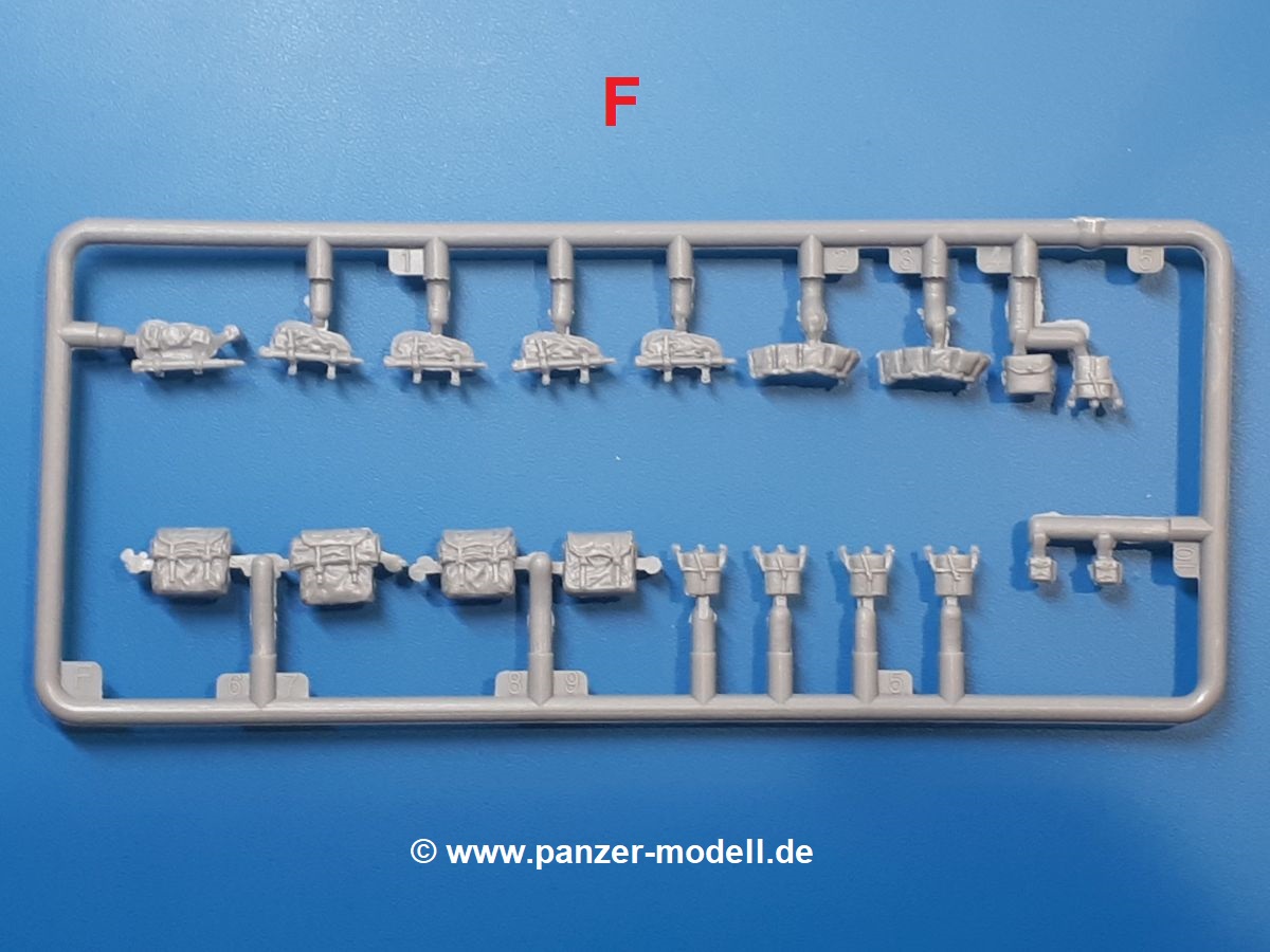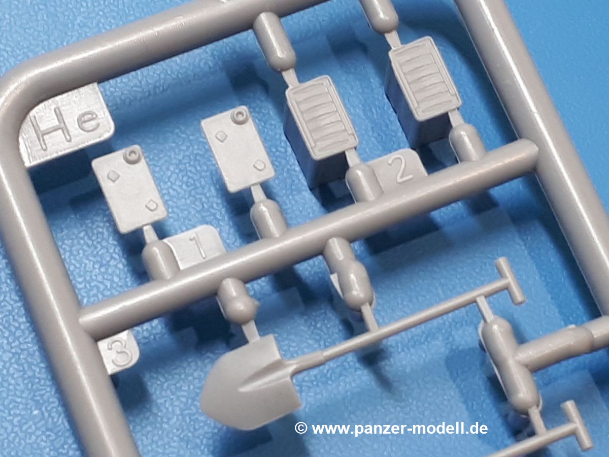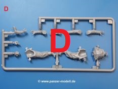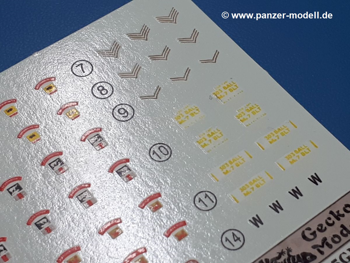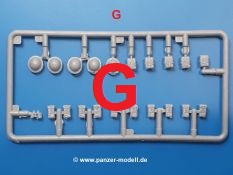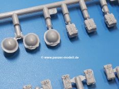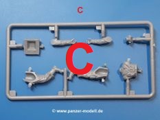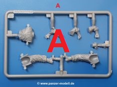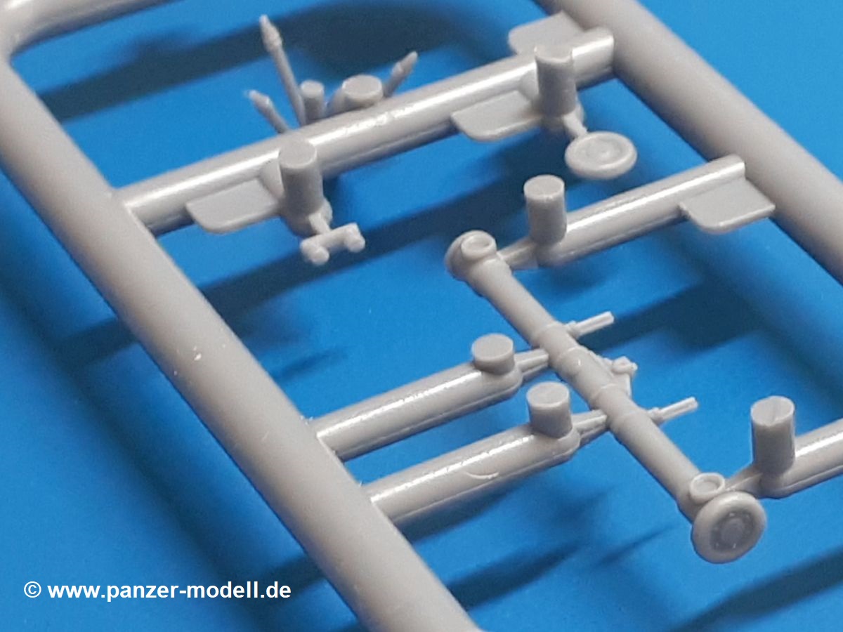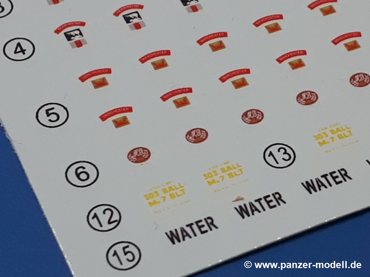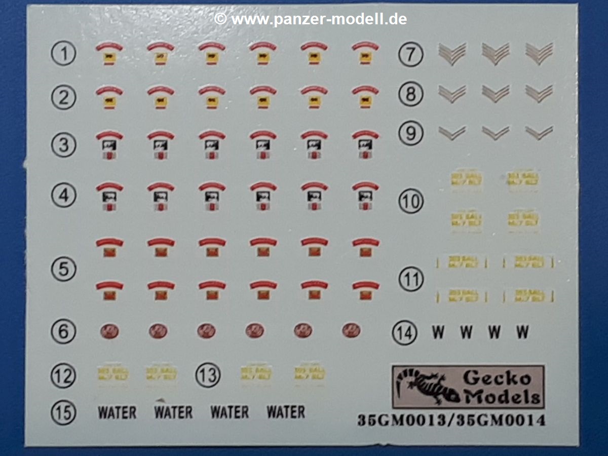 Die Teile sind sauber gespritzt, ohne Versatz und dicken Grat. Nur hier und da feiner Grat. Gesichter und Faltenwurf der Uniformen sind akzeptabel und für Spritzguss toll geworden. Viele Ausrüstungsgegenstände sind zur besseren Detaillierung mehrteilig ausgeführt, einige Details wie die Läufe der Waffen sind sehr filigran.Das Team besteht aus 5 Soldaten. Sie tragen Uniformen, wie sie im 2. Weltkrieg in Nord-Europa zum Einsatz kamen. Wer mitgezählt hat, konnte feststellen, dass es wesentlich mehr Arme als Soldaten gibt. Nein, das ist keine Spezialeinheit bestehend aus indischen Göttern, sondern Gecko Models ermöglicht für 4 der 5 Figuren je 2 Optionen.Dem Bausatz geschuldet ist der Mittelpunkt das Vickers-MG Kal. 0.303, das mit 2 verschiedenen Läufen gebaut werden kann. Die Laufmündungen sind natürlich bereits ausgehöhlt. Verschlussgehäuse, Handgriffe und Direktvisier sind separat vorhanden. Das dazugehörige, ausgeklappte Dreibein nimmt das MG-Lager mit Höhenstelleinrichtung auf und besteht aus insgesamt 6 Teilen. Ein Wasserkanister für die Kühlung, ein Gurtkasten und Munitionsgurt vervollständigen das Vickers. Anders als bei dem MG-Team im Einsatz werden die Teile auf die Soldaten aufgeteilt.Wer ist denn nun wer? Durch die vielen Optionen wird das nicht mehr so eindeutig. Beschreiben wir die Soldaten mal anhand der Spritzling-Nummern.Spritzling A: Option 1 stellt den, das ausgeklappte Dreibein auf den Schultern tragenden Soldaten dar. Seine Arme sind dabei lässig über die Beine des Gestells gelegt. Die Ärmel der Jacke sind hochgekrempelt. Auf dem Kopf trägt er den typischen Brodie-Helm (im deutschen auch Tellerhelm genannt). Vorn trägt er 2 große Magazintaschen, an der rechten Seite eine Feldflasche, an der linken 1 Ausrüstungstasche und hinten eine Tasche mit Grabwerkzeug. In der Option 2 trägt er das Bren-MG mit eingeklapptem Zweibein auf der linken Schulter, den Arm über den Lauf gelegt. Mit der rechten Hand hält er sich an einer Magazintasche fest. Helm und Ausrüstung wie in Option 1.Spritzling B: Auch hier gibt es 2 Optionen, aber in der Anleitung ist wohl etwas nicht ganz richtig, so dass ich bei der 2. Version etwas raten muss. Auf alle Fälle ist er derjenige, der das Vickers-MG trägt. Das MG liegt auf der rechten Schulter auf, die rechte Hand hält es am Bediengriff. Mit der linken Hand trägt er einen MG-Kasten. Seine Ausrüstung besteht natürlich aus dem Helm, dazu eine Feldflasche an der rechten Seite, 2 kleine Ausrüstungstaschen vorn am Koppel, eine große an der linken Seite. Dort finden wir auch einen Spaten, dessen Blatt an der linken Brust anliegt und der Stiel nach hinten links herausschaut. Auf dem Rücken trägt er einen Rucksack. Die 2. Option ist bis auf den rechten Arm gleich. Der rechte Arm hängt mit geöffneter Hand herunter. Ich rate mal, dass man ihm einen weiteren Gurtkasten oder einen Karabiner in die Hand geben könnte.Spritzling C: Der Munitionsträger ist der einzige ohne weitere Option. Er trägt in beiden Händen Munitionskästen und auf dem Rücken einen Munitionsrucksack. Vorn trägt er 2 große Magazintaschen, an der rechten Seite eine Feldflasche, an der linken 1 Ausrüstungstasche und hinten eine Tasche mit Grabwerkzeug. Selbstverständlich trägt auch er einen Brodie-Helm.Spritzling D: Ich möchte ihn mal den Sicherungsschützen nennen, denn er trägt entweder ein Bren-MG mit beiden Händen einsatzbereit vor dem Körper oder einen Karabiner in der rechten Hand. Seine Ausrüstung besteht in beiden Optionen aus Helm auf dem Kopf, Feldflasche an der rechten Seite, 2 großen Magazintaschen vorn, eine große Ausrüstungstasche an der linken Seite und einem Rucksack auf dem Rücken.Spritzling E: Hier haben wir, zumindest in der Version mit der Sten-MP, den Truppführer vor uns. Mit der rechten Hand hält er sich an einer Magazintasche fest, in der linken trägt er den Wasserkanister für die MG-Kühlung. Seine Ausrüstungsgegenstände sind Helm, 2 große Magazintaschen vorn, eine große Ausrüstungstasche an der linken Seite, ein Rucksack auf dem Rücken und die Tasche mit Grabwerkzeug. Vorn schräg über die Hüfte trägt er noch einen Gurt mehren Taschen. Alternativ trägt er dann als Truppführer die Sten-MP an der rechten Seite oder als Beobachter das Entfernungsmessgerät in seiner Schutztasche.Für die Stahlhelme, Taschen und Waffen gibt es Gurte aus PE-Material. Auch die Tragegriffe für den MG-Kasten und die Wasserkanister sind aus PE.Der Decalbogen hat Rangabzeichen vom Korporal bis zum Sergeanten anzubieten. Dazu kommen Beschriftungen für die Wasserkanister und Munitionskisten, MG-Schützenabzeichen und Einheitsabzeichen. Unter den Einheiten sind eindeutig zu erkennen die 11th Armoured Division (schwarzer Bulle in gelbem Feld), die 49th Infantry Brigade (Polarbär in schwarzem Feld) und die 53rd (Welsh) Infantry Division (rote Krone in braunem Feld).Die teils farbige Bauanleitung zeigt die gebauten Figuren mit den Nummern, wohin die Teile gehören. Die Bemalungshinweise sind pro Figur mittels Farbnamen angegeben. Anhand eines aufrecht gehenden Soldaten wird die Anbringung der Rang- und Einheitsabzeichen gezeigt. Der Zusammenbau von Munitionskisten, Wasserkanistern, Vickers-MG, Entfernungsmesser und Waffen erscheint in Extra-Bauschritten. Dies gilt auch für die Anbringung der PE-Gurte. Ein weiterer Schritt ist der Anbringung der Decals an Wasserkanistern und Munitionskisten gewidmet. Dort findet man auch die Farbangaben dazu, ebenso wie die Bemalung der Schaufel und der Tassen. Der letzte Schritt zeigt die Anbringung der PE-Gurte an Helm, Tasche und Fernglas-Etui sowie deren Bemalung.Nach dem MG-Team in Aktion ist dieser Satz auch hochwillkommen. Das Team befindet sich im aufrechten Gang beim Marsch fernab vom Feind. Aufgrund der vielen Figurenoptionen ist man mit 2-3 dieser Bausätze sicher gut bedient. Der Preis um die 16 EUR macht diese Figuren sicher noch attraktiver. Fans der britischen Armee ran an den S